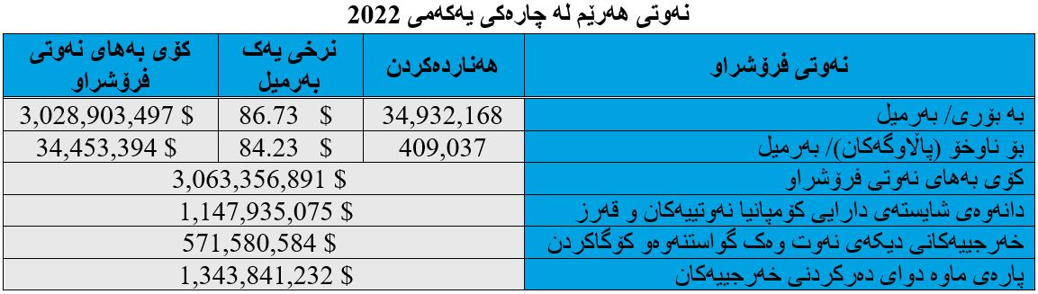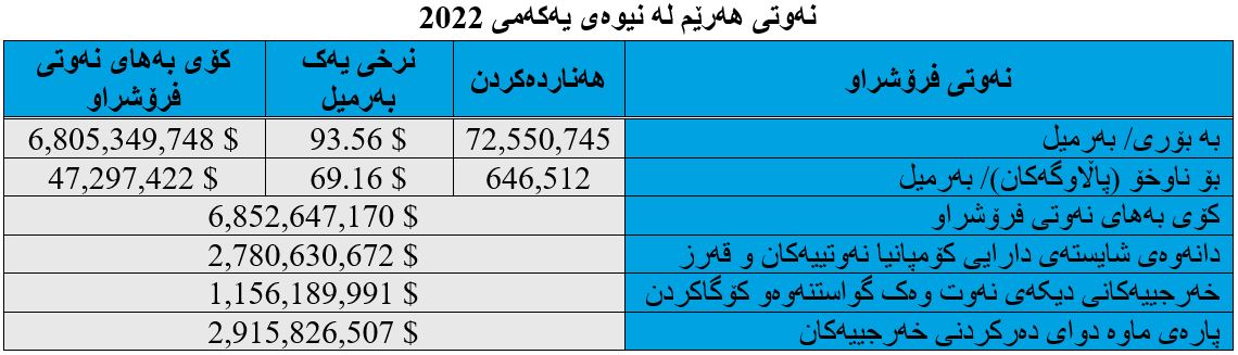پاڵپشت بەو داتایانەی هەردوو چارەکی یەکەم و دووەمی (2022)، حکومەتی هەرێمی کوردستان لە نیوەی یەکەمی ئەمساڵ واتە لە نێوان (1ی کانونی دووەمی 2022 بۆ 31ی حوزەیرانی 2022) بڕی (72 ملیۆن و 550 هەزار و 745) بەرمیل نەوتی لە ڕێگەی بۆرییەوە فرۆشتووەو کۆی بەهاکەی (6 ملیار و 805 ملیۆن و 349 هەزار و 748) دۆلار بووە، هەر بەرمیلێک نەوتی بە تێکڕای (93.56) دۆلار فرۆشتووە، ئەمە لە کاتێکدایە نرخی بەرمیلێک نەوتی برێنت لە بازاڕەکانی جیهان بەهاکەی بە تێکڕا (106.99) دۆلار بووە. واتە لە نیوەی یەکەمی (2022)دا هەر بەرمیلێک نەوت بە (13.43) دۆلار هەزانتر فرۆشراوە.