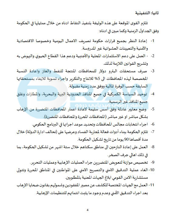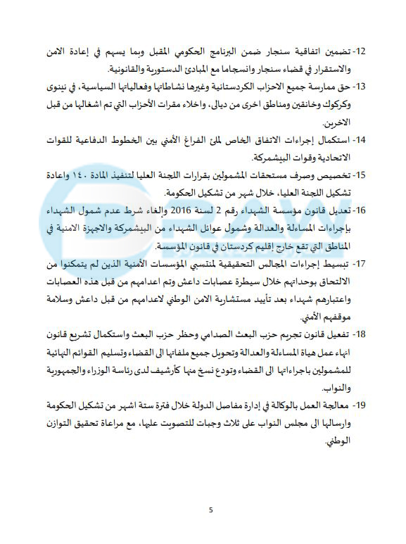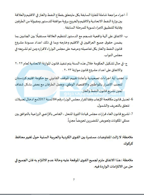 *بە تێبینی لە رێککەوتنەکە نوسراوە « تا ئێستا گفتوگۆکانی کورد و سوننە لەسەر گۆڕینی پارێزگاری کەرکوک بەردەوامە».