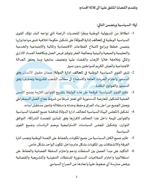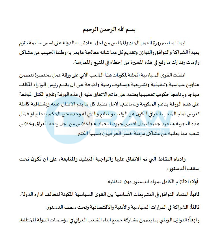 (درەو) دەقی رێككەوتنی لایەنەكانی عێراق بۆ پێ:هێنانی حكومەت بڵاودەكاتەوە