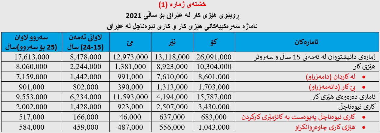 یەکەم؛ ئاماژە سەرەکییەکانی هێزی کار و کاری نیوەناچل لە عێراق بۆ ساڵی 2021