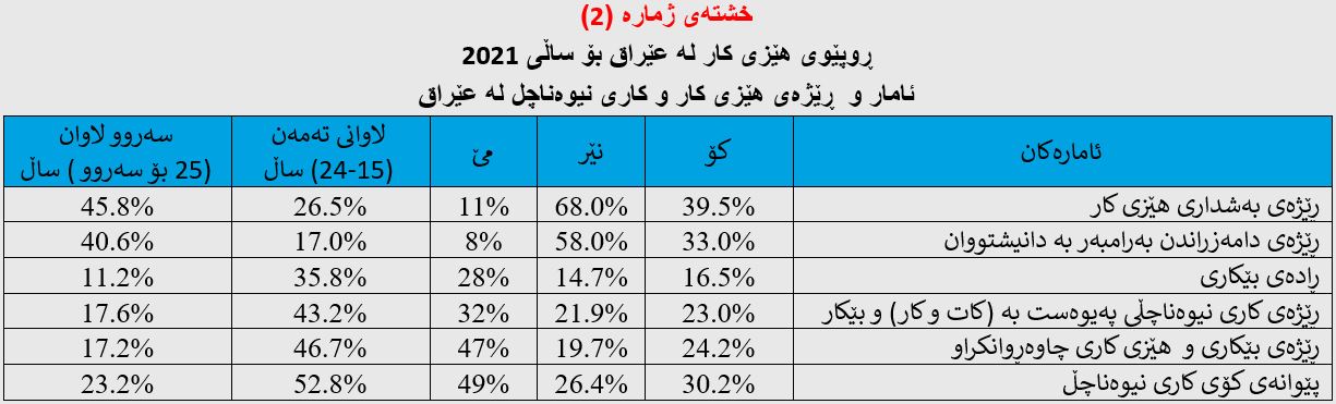 هەر سەبارەت بە هێزی کارو ڕێژەی بێکاری بەپێی ڕوپێوییەکە کۆی ڕێژەی بەشداری هێزی کار لە بازاڕی کاری عێراقیدا بریتیە لە (39.5%) و ڕێژەی دامەزراندن بەرامبەر بە ژمارەی دانیشتووان دەگاتە (33%)، تێکڕای ڕادەی بێکاری (16.5%) تێدەپەڕێنێت، ئەوانەشی کاری نیوەناچڵ لە (کات و جۆر)ی کاردا ئەنجام دەدەن (23%)ن و ڕێژەی بێکاری و هێزی کاری چاوەڕوانکراو دەگاتە (24.2%). بۆ وردەکاری زیاتر دەربارەی ڕێژەی هێزی کار و بێکاری و کاری نیوەناچڵ لە عێراق بۆ ساڵی (2021) بەپێی ڕەگەزو تەمەن بڕوانە (خشتەی ژمارە (2))