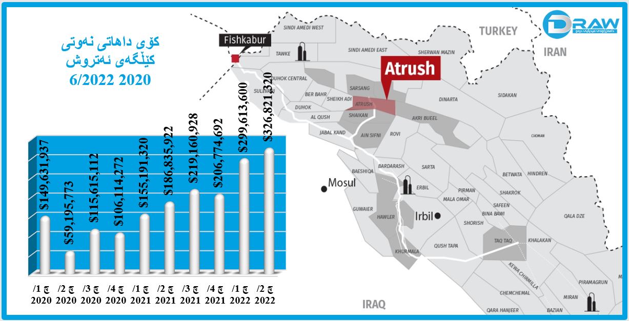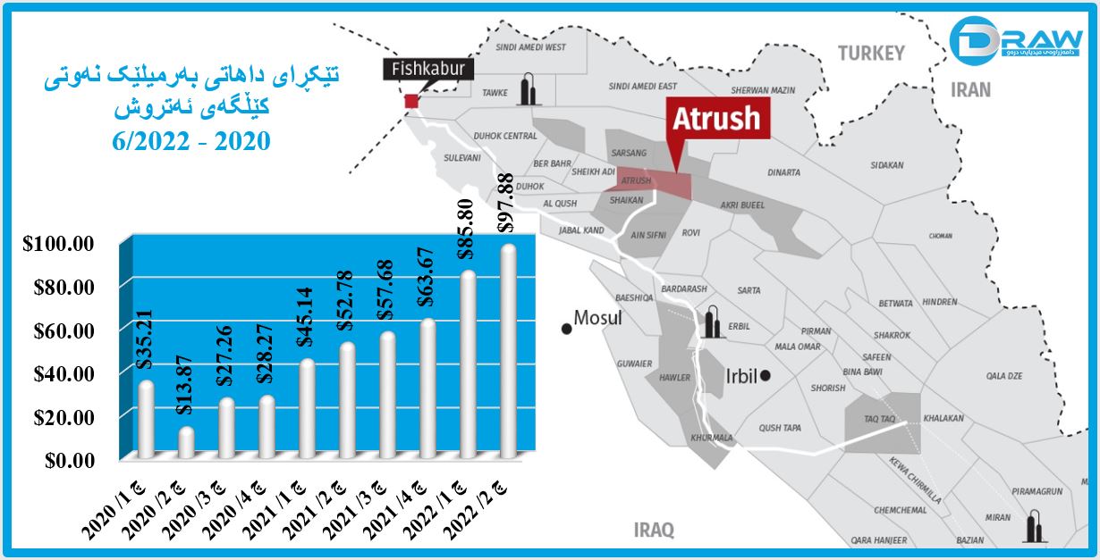 # سێ مانگی دووەمی ساڵی (2022) کۆی داهاتی نەوتی ئەتروش بریتی بووە لە (326 ملیۆن و 821 هەزار و 320) دۆلار، تێکڕای داهاتی هەر بەرمیلێک (97.88) دۆلار بووە، ئەمەش تۆمارکردنی بەرزترین ئاستی داهاتە لە ماوەی ناوبراوە.