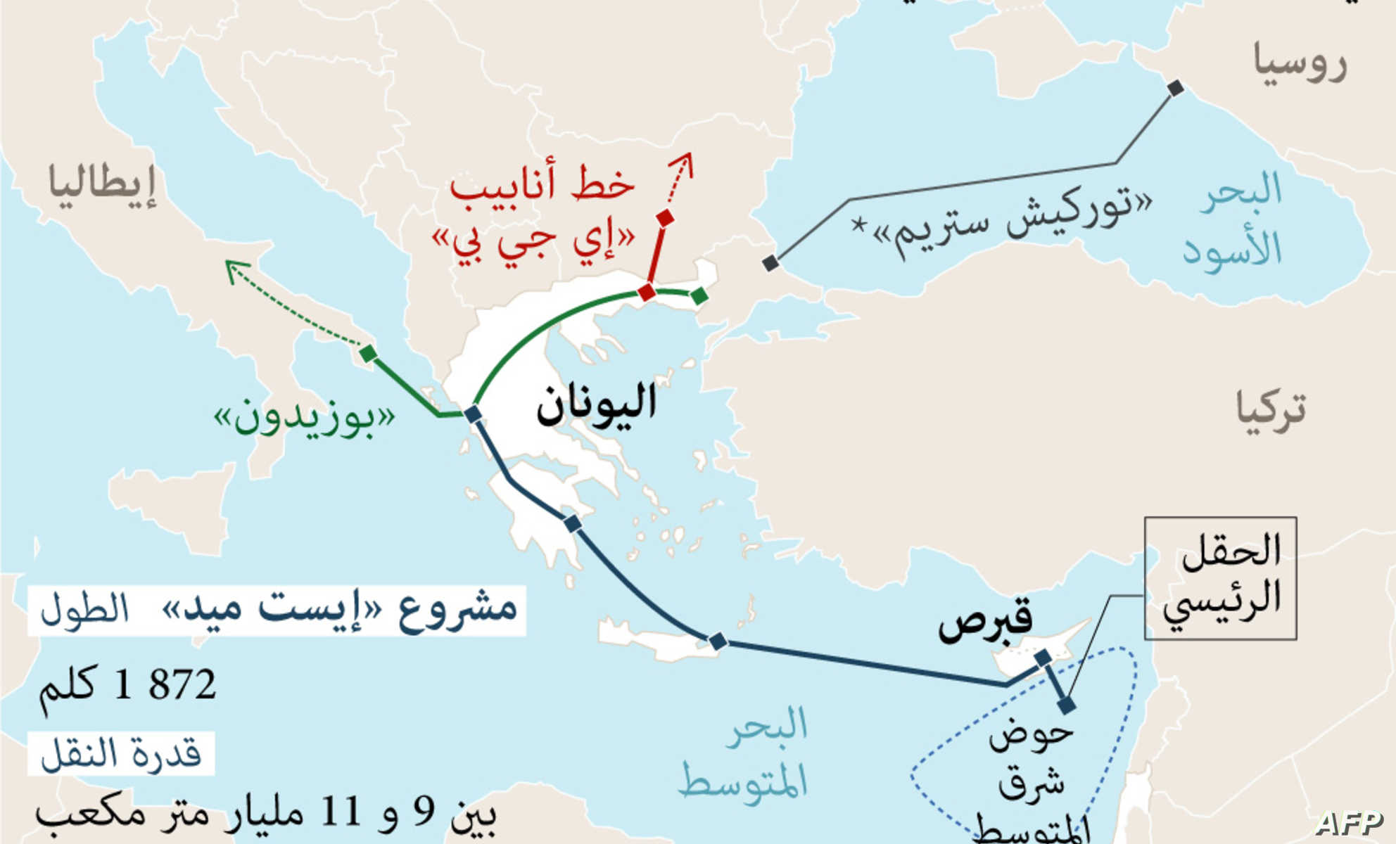 ساڵى (2010) ههریهكه له قوبرس و ئیسرائیل جاڕى ئهوهیاندا له سنوره ئاوییهكانى خۆیان له ژێر ئاودا گازى سروشتییان دۆزیوهتهوه. له (ئۆگهستى 2019) ههریهكه له قوبرس و ئیسرائیل و یۆنان به پاڵپشتى ویلایهیهكگرتوهكان له ئهسینا ڕێككهوتنیان بۆ هاوپهیمانى گازى سروشتی واژۆكرد. تهنانهت فرانك فانون -Frank Fannon یاریدهدهرى وهزیرى دهرهوهى ئهمریكا بۆ سهرچاوه سروشتییهكان ئامادهى كۆبونهوهكه بو. بهیهكیشهوه ههریهكه له میسرو قوبرس و ئیسرائیل و یۆنان لوتكهى دهریاى سپى ناوهڕاستیان بۆ وزه ههیه، ههردوو سهرۆك و وهزیرى دهرهوهى پێشوى ئهمریكا ترامپ و مایك پۆمبیۆ پاڵپشتى گهورهیان بۆ پرۆژهكه ڕاگهیاند. دۆزینهوهى ئهم یهدهگه له كێڵگهكانى لێڤاسان-Leviathan ى ئیسرائیل و ئهفرۆدیتى-Aphrodite قوبرس لهلایهك توركیاى نیگهران كرد له باشورى حهوزهى دهریاى سپى ناوهڕاست، لهلایهك وهك خهونێكى ستراتیجى له باشورى ئهوروپا هاتۆته دى، كه ئیدى ئهوروپا پێویستى به گازى سروشتى ڕووسیا نابێت و، گاز له قوبرس (وهك وڵاتێكى ئهوروپى) و ئیسرائیلهوه هاورده ئهكات. لهسهرهتاى (2021) دا هێڵى بۆڕى ڕۆژههڵاتى دهریاى سپى-East- Med Pipeline به درێژایی (1900كم) و به بڕى (7) ملیار دۆلار كهوته كار بۆ گواستنهوهى گازى سروشتى ئیسرائیل و قوبرس له ڕێگهى یۆنانهوه بۆ ئیتاڵیاو مهكهدۆنیاو سربیاو...تادوایی(9). ئهم پرۆژهیه ههراو گۆڵمهزى زۆرى پێوهیه:
