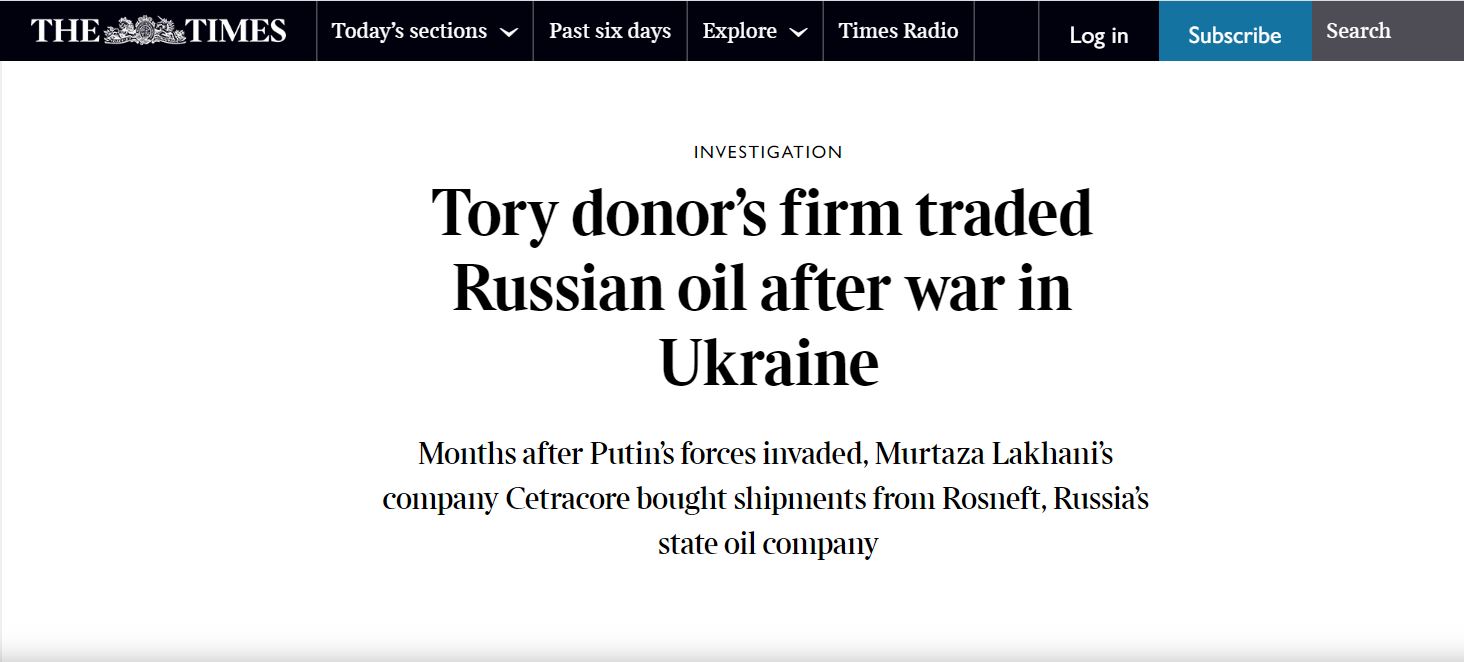 رۆژنامەی تایمزی بەریتانی لە راپۆرتێكدا بڵاویكردووەتەوە (مورتەزا لاخانی) كە بازرگانێكی نەوتی كەنەدی-پاكستانییە، پێش سەركەوتنی بۆریس جۆنسۆن لە هەڵبژاردنەكاندا لە ساڵی 2019، لە ڕێگەی كۆمپانیایەكەوە (500 ) هەزار پاوەندی بە پارتەكەی جۆنسۆن بەخشیوە، ئەو ئێستا پەیوەندی بەهێزی لەگەڵ كۆمپانیای نەوتی روسی (ڕۆسنەفت) دا دروستكردووەو بەردەوام بووە لە بازرگانیكردن بە نەوتی ڕووسیا لە كاتی شەڕی روسیا- ئۆكرانیا.
