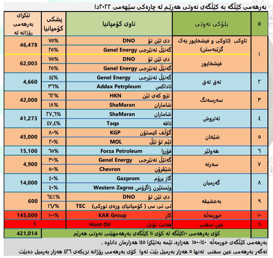 بەپێی ئەو ئامارانەی لە بەردەستی روونبیندایە و لەم خشتەیەی خوارەوەدا ڕوونکراوەتەوە لە کۆی ١١ کێڵگەی بەرهەمهێنی نەوتی هەرێم تێکڕای بەرهەمی رۆژانە بریتیە لە ٤٢٦ هەزار بەرمیل،