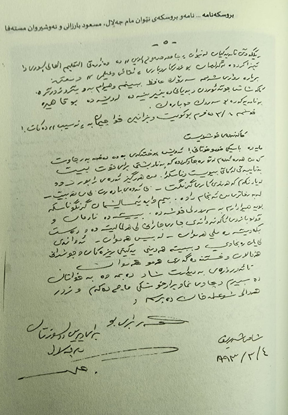 سەرچاوە: بروسكەنامە، نامەو بروسكەكانی نێوان (مام جەلال، مەسعود بارزانی و نەوشیروان مستەفا) 1990 -2009، سەڵاح رەشید، چاپی یەكەم 2023، لا553-557.