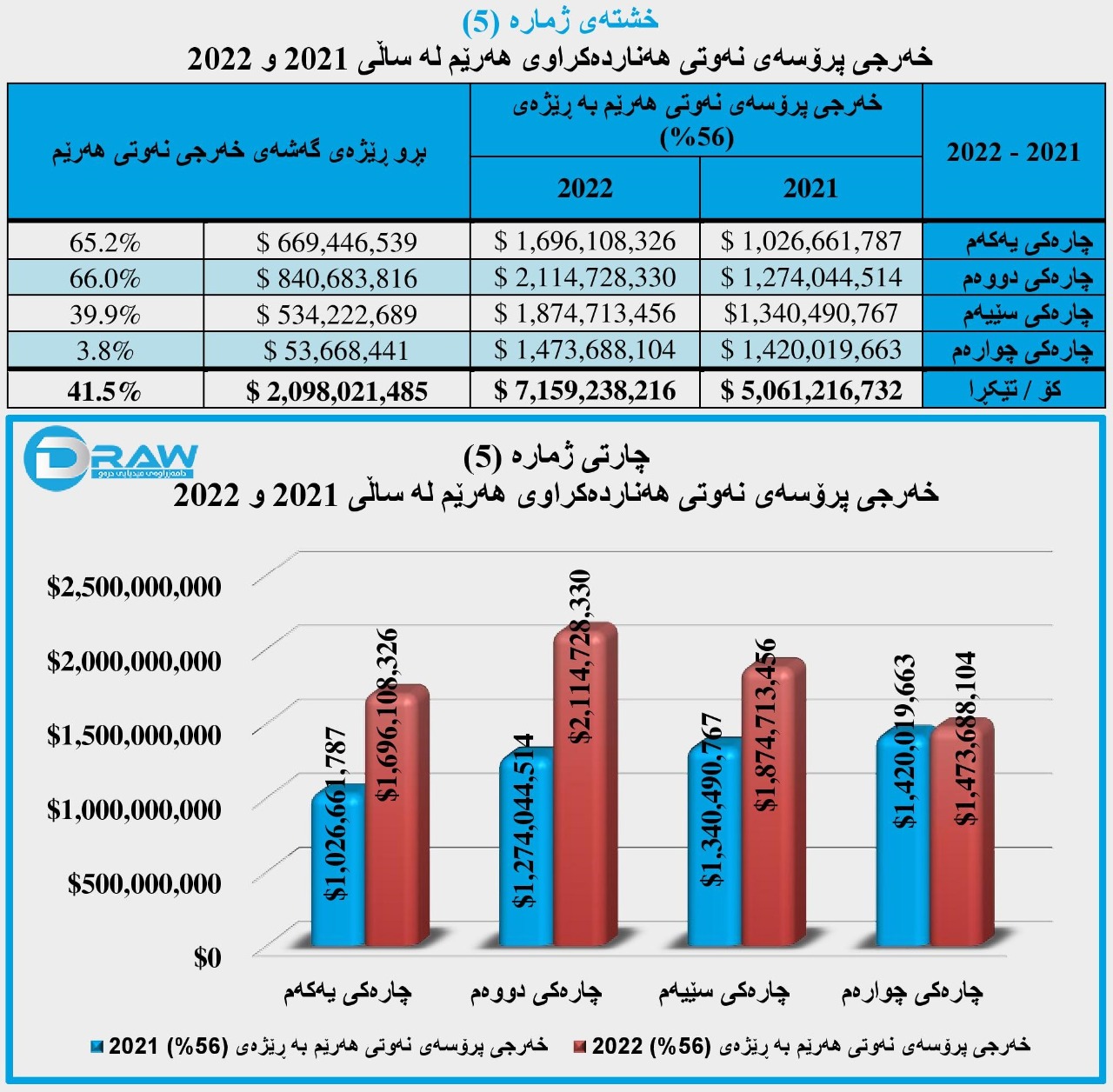 واتە بڕی (2 ملیار و 98 ملیۆن و 21 هەزار و 485) دۆلار بە ڕێژەی (41.5%) خەرجی نەوتی هەرێم لە (2022)دا زیاتری کردووە، بەراورد بە ساڵی (2021). (بۆ وردەکاری بڕوانە خشتەو چارتی ژمارە (5))