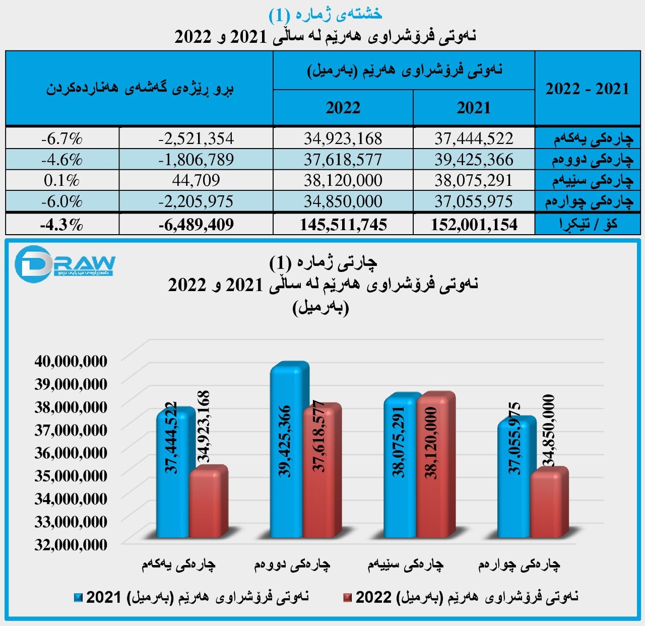? ئاستی نەوتی فرۆشراوی هەرێم لە ساڵی (2022) دا، بەراورد بە ساڵی (2021) ، نزیکەی (6.5 ملیۆن) بەرمیل و بە ڕێژەی (4.3%) دابەزیوە.