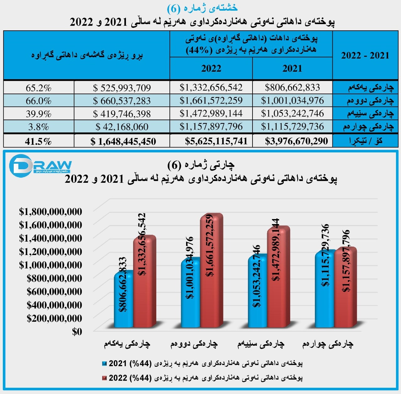 واتە بڕی (1 ملیار و 648 ملیۆن و 445 هەزار و 450) دۆلار و بە ڕێژەی (41.5%) پوختەی داهاتی نەوتی هەرێم لە (2022)دا زیاتری کردووە، بەراورد بە ساڵی پێشتر. (بۆ وردەکاری بڕوانە خشتەو چارتی ژمارە (6))
