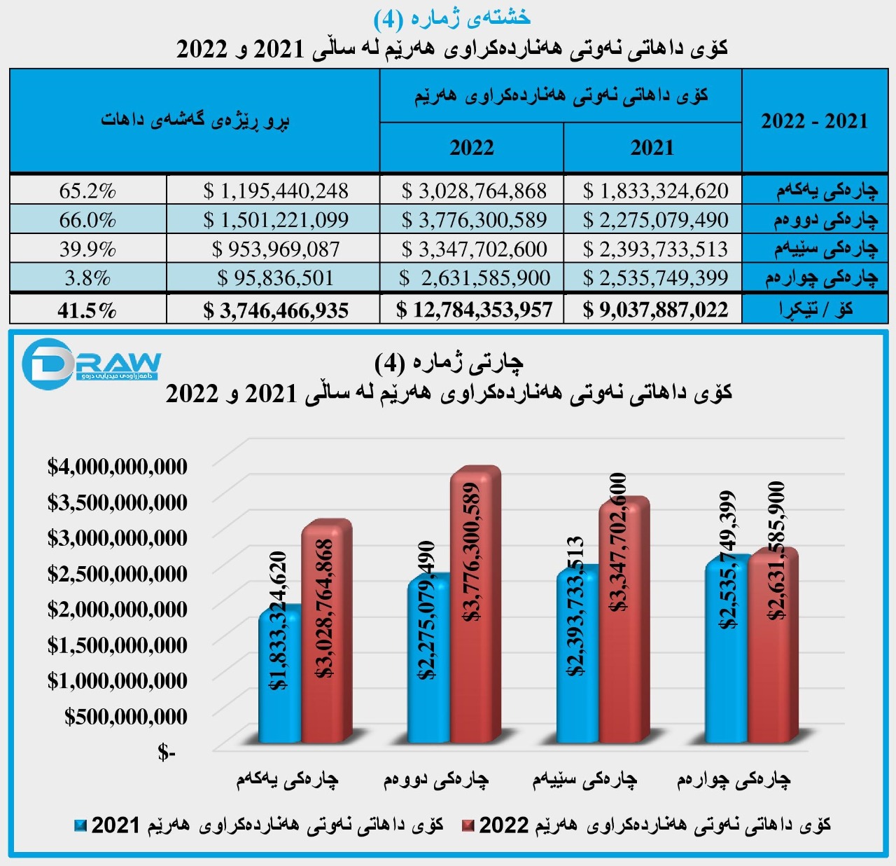 چوارەم؛ کۆی داهاتی نەوتی هەرێم لە ساڵی 2021 و 2022