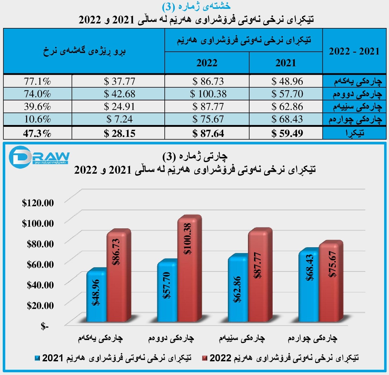 کەمترین بەرزبوونەوەش لە بەراوردی هەردوو چارەکی چوارەمی ساڵەکانی (2021 و 2022) رویداوە بە ڕێژەی (10.6%) و بە بەهای (7.24) دۆلار بۆ هەر بەرمیلێک. (بۆ وردەکاری بڕوانە خشتەو چارتی ژمارە (3))