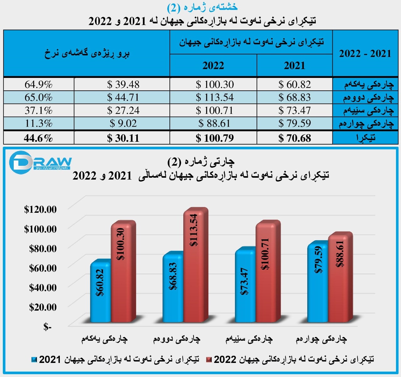 بەپێی داتاکانی ماڵپەڕی (Country Economy) تێکڕای نرخی نەوت لە بازاڕەکانی جیهان لە تەواوی ساڵی (2022)دا بریتی بووە لە (100.79) دۆلار. لە کاتێکدا تێکڕای نرخی نەوت لە ساڵی (2021)دا بریتی بووە لە (70.68) دۆلار.
