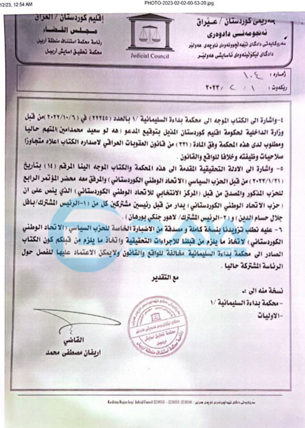 • سەبارەت بەو نوسراوەی كە ئاراستەی دادگای بەرایی سلێمانی كراوە لە 6/10/2022دا لەلایەن وەزارەتی ناوخۆوە، نوسراوەكە ئیمزای هەڵۆ سەعید محەمەد ئەمینی لەسەرە كە ئێستا تۆمەتبارەو لە دادگای لێكۆڵینەوەی ئاسایش داواكراوە بە گوێرەی مادەی (231) ی یاسای سزادانی عێراقی بەهۆی ئەوەی لە دەركردنی ئەم نوسراوەدا زیادە رۆیی لە دەسەڵاتی خۆی و ئەركەكەی كردووەب ە پێچەوانەی یاساوە،