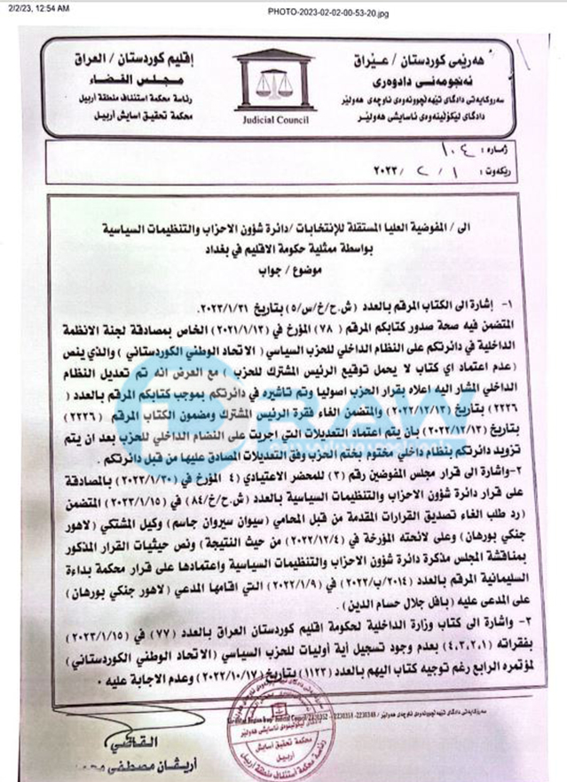 دادگای لێكۆڵینەوەی ئاساییشی هەولێری سەربە ئەنجومەنی دادوەری هەرێمی كوردستانە بڕیارێكی دەركردووەو بە نوسراوێك كە لە رێگەی نوێنەرایەتی حكومەتی هەرێم لە بەغداد (فارس عیسا) ئاراستەی فەرمانگەی كاروباری حزب و رێكخراوە سیاسیەكانی كردووە لە كۆمسیۆنی باڵای هەڵبژاردنەكانی عێراق دەڵێت: