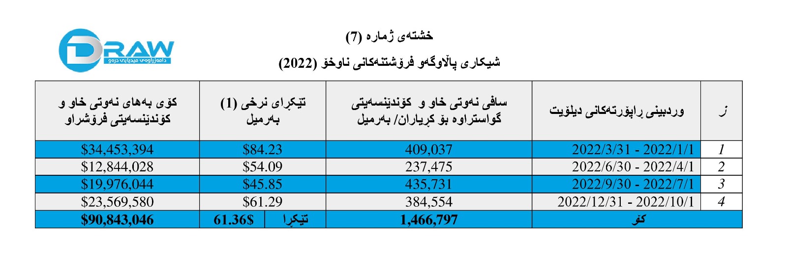• بەرهەمی نەوت و هەناردە و بەکاربردن و داهات لە ماوەی ١ی نیسانی 2022 تاکو ٣٠ی حوزەیرانی 2022.
