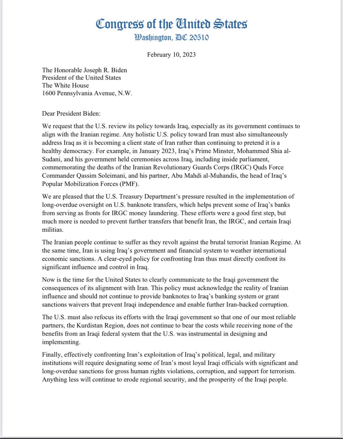 داوا لە ویلایەتە یەكگرتووەكانی ئەمریكا دەكەین پێداچوونەوە بكات بە سیاسیەتەكانی لەبەرامبەر عێراق، بەتایبەتیش كە حكومەتی عێراق بەردەوامە لەسەر لایەنگیری بۆ رژێمی ئێران، پێویستە هەر سیاسەتێكی گشتگیری ئەمریكا بەرامبەر بە ئێران، لەهەمان كاتدا عێراقیش بگرێتەوە، چونكە بووە بە دەوڵەتێكی بەكرێگیراوی ئێران لەبری ئەوەی بەشێوەیەكی بەردەوام وەكو دەوڵەتێكی دیموكراتی ئاشتیخواز دەربكەوێت، بۆ نموونە لە كانونی دووەمی 2023دا محەمەد شیاع سودانی سەرۆك وەزیرانی عێراقو حكومەتەكەی، لەسەرتاسەری عێراق، بەناو پەرلەمانیشەوە، مەراسیمیان سازكرد بۆ یادی كوژرانی قاسم سولەیمانی فەرماندەی فیرقەی قودسی سوپای پاسدارانی ئێرانو هاوبەشەكەی (ئەبو مەهدی موهەندیس) فەرماندەی هێزەكانی حەشدی شەعبی عێراق.