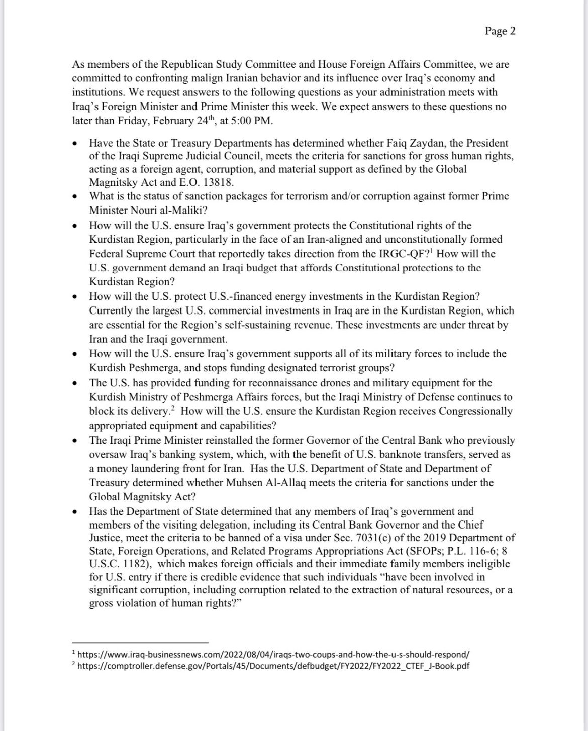 وەكو ئەندامانی لیژنەی توێژینەوەو لیژنەی كاروباری دەرەوە لە ئەنجومەنی نوێنەران پابەندین بە روبەڕووبونەوەی رەفتارە خراپەكانی ئێرانو كاریگەرییەكانی لەسەر ئابوری عێراقو دامەزراوەكانی. داوای وەڵامدانەوەی ئەم پرسیارانە دەكەین كاتێك ئیدارەكەتان لەم هەفتەیەدا لەگەڵ وەزیری دەرەوەو سەرۆك وەزیرانی عێراق كۆدەبێتەوە، چاوەڕوانی وەڵامی ئەم پرسیارانە دەكەین لە وادەیەكدا كە رۆژی هەینی 24ی شوباتی 2023ی كاتژمێر 5:00ی ئێوارە تێپەڕ نەكات.