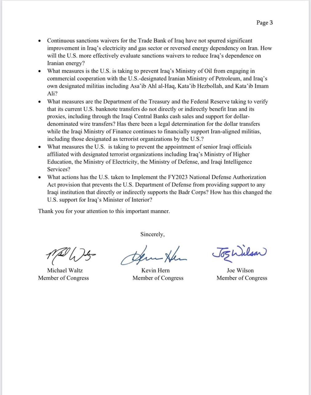 ئەو سێ كۆنگرێسمانە رۆژی 10ی ئەم مانگە نامەكەیان ئاڕاستەی جۆ بایدنی سەرۆكی وڵاتەكەیان كردووە، واتە بەر لە سەردانی وەفدی حكومەتی عێراق بۆ واشنتۆن، تێیدا لەبارەی دۆخی عێراقو هەرێمی كوردستانەوە (13) پرسیاریان كردووەو چاوەڕێ دەكەن رۆژی 24ی ئەم مانگە سەرۆكی ئەمریكا وەڵامیان بداتەوە.