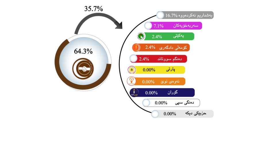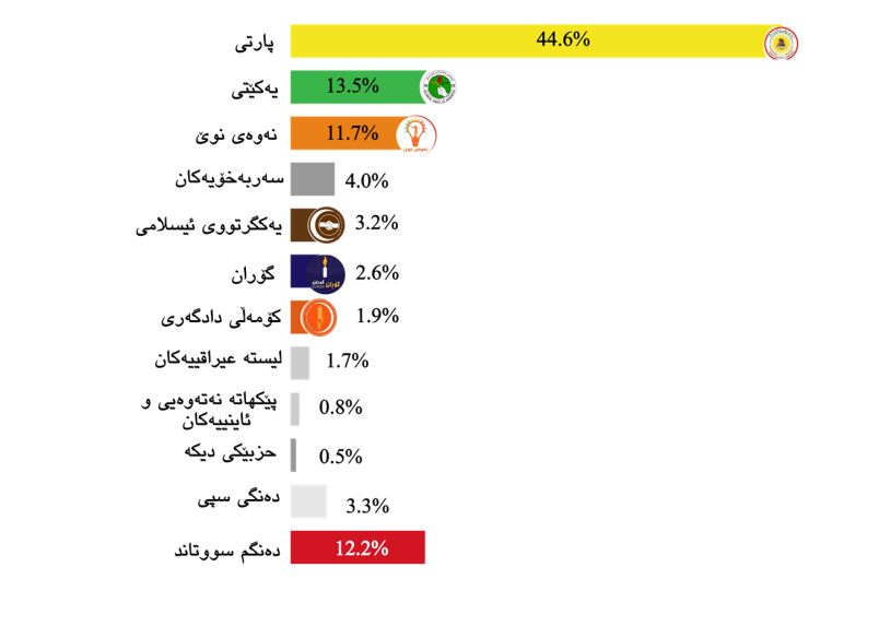لە وێنەی ژمارە (٢) دا دەردەکەوێت دەنگی پارتی بەرزبووتەوە بۆ ٤٤.٦% و یەکێتی گۆڕانکارییەکی وەهای بەسەردا نەهاتووە و بەڕێژەی ١٣.٥% دەنگی بۆ چووە. نەوەی نوێ بە شێوەیەکی بەرچاو دەنگەکانی زیادی کردووە (١١.٧%). سەربەخۆیەکان کە لە هەڵبژاردنی ٢٠٢١ بەشدارییان کرد توانییان دەنگێکی بەرچاو بەدەست بهێنن و دەنگی نموونەکەشمان بەرێژەی ٤% چووە بۆیان. بزوتنەوەی گۆڕان دەنگەکانی بە شێوەیەکی بەرچاو کەمی کرد و ئەوانەش کە دەنگیان سووتاند بۆ ١٢.٢% هەڵکشاوە.