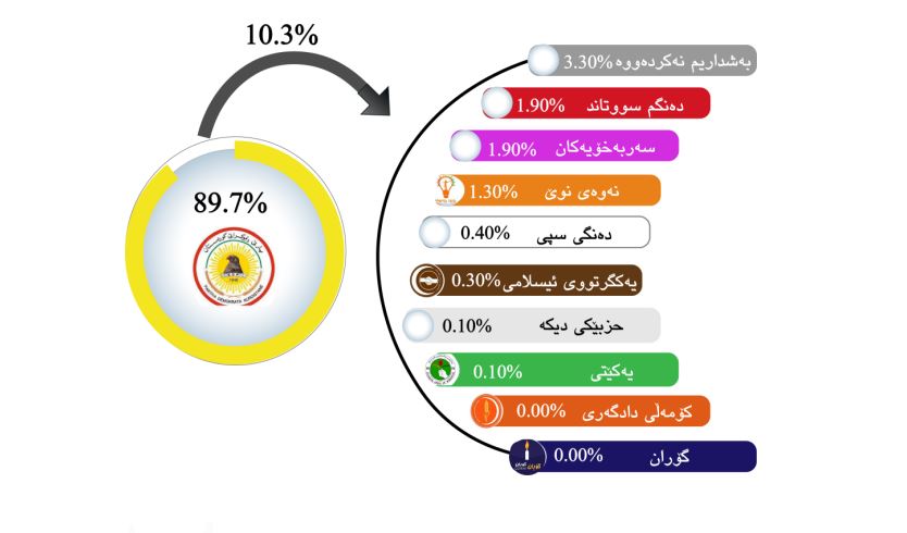 • دەنگدەرانی پارتی (3.3%)یان بەشداریان نەكردووە، (1.9%) دەنگەكانیان سوتاندووە، (1.3%)ی دەنگی پارتی بۆ نەوەی نوێ چووە.