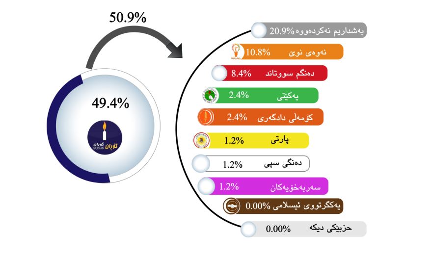 • دەنگدەرانی گۆڕان (20.9%)ی بەشداریان نەكردووە، (10.8%) دەنگدەرانیان دەنگیان بەنەوەی نوێ داوە، (8.4%)یان دەنگەكانیان سوتاندووە، (1.2%) دەنگیانداوە بە پارتی.