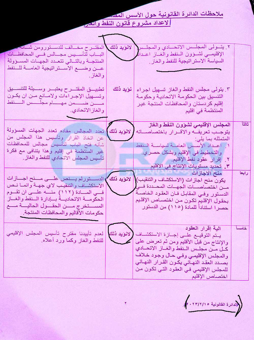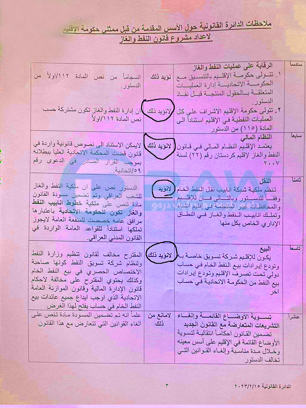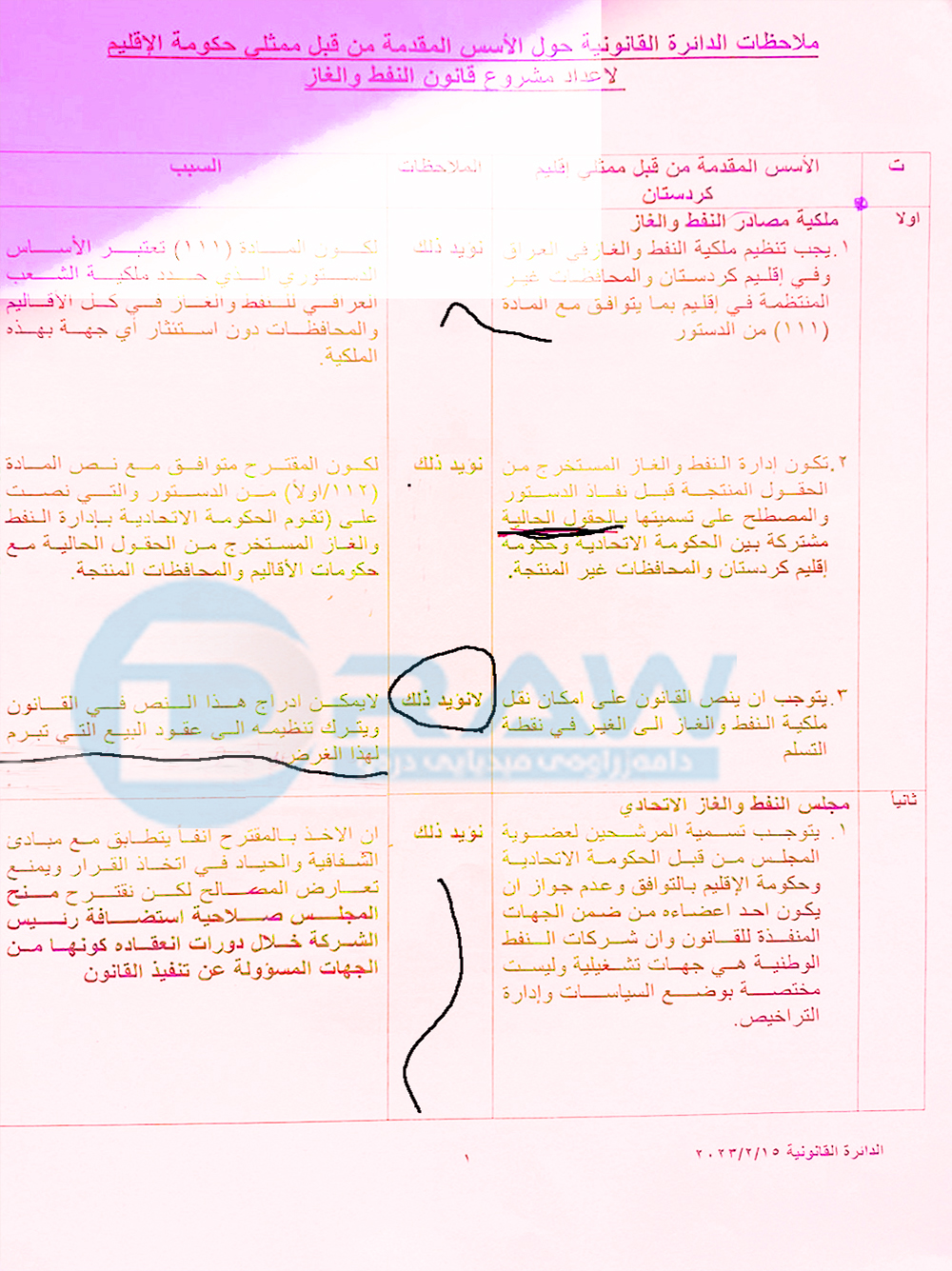 بەپێی بەڵگەنامەیەك كە دەست (درەو) كەوتووە، فەرمانگەی یاسایی لە وەزارەتی نەوتی عێراق لە رۆژی 15/2/2023 وەڵامی پێشنیازەكانی هەرێمی كوردستان دەداتەوە سەبارەت بە یاسای نەوت و غاز و لەكۆی (15) پێنشیاز (10) پێشنیازی رەت دەكاتەوە. ئەو پێشنیازانە راستەوخۆ ئاراستەی وەفدی هەرێم نەكراوە، بەڵكو فەرمانگەی یاسایی ئاراستەی وەزارەتی نەوتی عێراقی كردووە، وەفدی دانوستانكاری بەغداد لەسەر بنەمای ئەو پێنشیازانە لەگەڵ وەفدی هەرێم دانوستان دەكات.