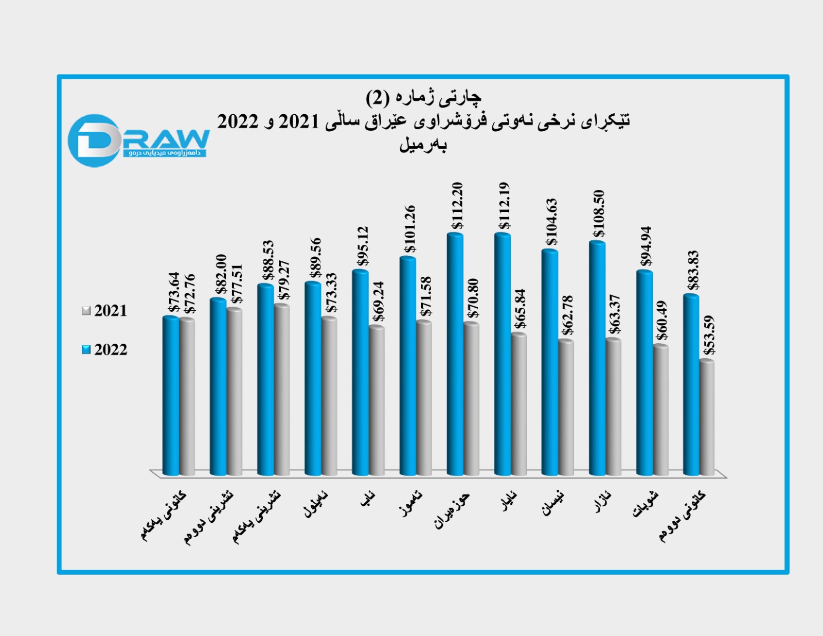 سەبارەت بە نرخ و ساغکردنەوەی نەوتی عێراق لە لایەن کۆمپانیای بەبازاڕکردنی نەوتی عێراق (سۆمۆ)، لە ساڵی (2021)دا بە تێکڕا بەرمیلێک نەوتی عێراق بە (68.4) دۆلار فرۆشراوە. بەڵام لە ساڵی (2022) هەر بەر میلێک (27) دۆلار و بەڕێژەی نزیکەی (40%) زیاتر فرۆشراوە، هەر بەرمیلێک نەوت بە تێکڕا دراوە بە (95.53) دۆلار. (بڕوانە خشتەی ژمارە (1) و چارتی ژمارە (2))