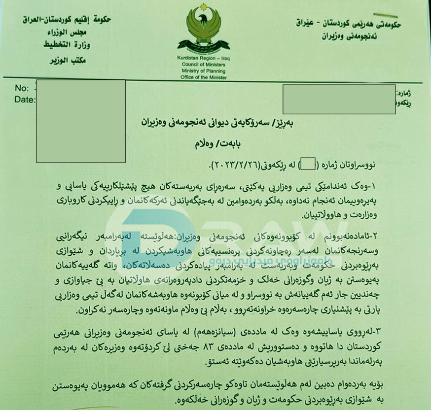 رۆژی 27ی شوباتی ئەمساڵ مەسرور بارزانی سەرۆكی حكومەت لەرێگەی ئومێد سەباح سەرۆكی دیوانی ئەنجومەنی وەزیران بە نوسراوێك داوای لە وەزیرەكانی یەكێتیی كردووە بگەڕێنەوە بۆ ناو كۆبونەوەكانی ئەنجومەنی وەزیران.