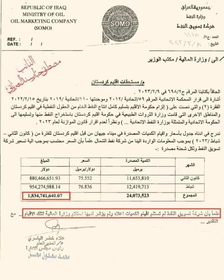 بە پێی نوسراوێكی كۆمپانیای بە بازاڕكردنی نەوتی عێراق (سۆمۆ) كە ئاراستەی وەزارەتی دارایی عێراقی كردووە سەبارەت بە داهات و فرۆشی مانگی شوباتی نەوتی هەرێمی كوردستان.