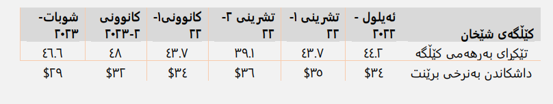 ئەم خشتەیەی خوارەوە کورتەیەک لە زانیارییەکانی نرخادن بۆ نەوتی هەرێم KBT کە لەلایەن حکومەتی هەرێمەوە بڵاوکراوەتەوە بۆ مانگەکانی ئەیلوولی ٢٠٢٢ تا ١ی ٢٠٢٣، لەوانەش کاریگەری لەسەر نرخە بەدەست هێنراوەکانی شێخان لە بەرامبەر میکانیزمی پێشووی نرخاندن: