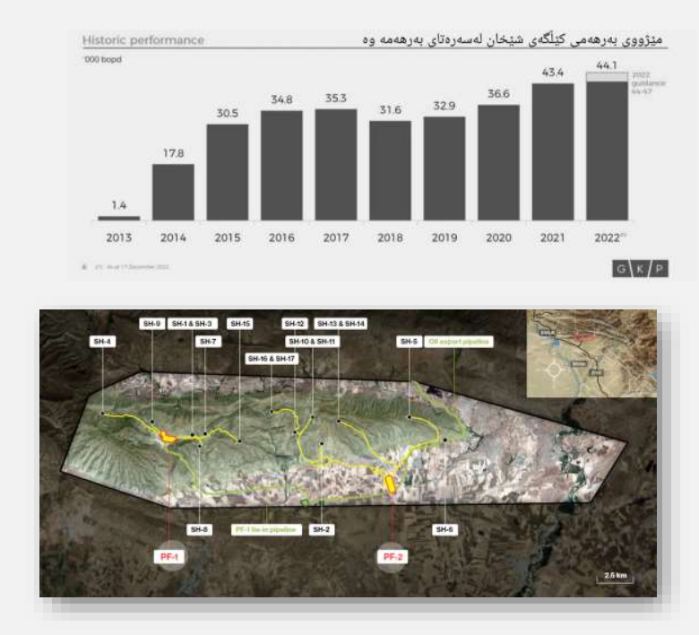 کۆمپانیای GKP دەڵێت "بەپێی ڕاپۆرتی ("2022 CPR") کە هەڵسەنگاندنێکی سەربەخۆی لایەنی سێیەمی نوێکراوە بۆ یەدەگ و سەرچاوەکانی کێڵگەی شێخان کە لەلایەن ERC Equipoise ("ERCE") ئامادەکراوە. توانای گەشەکردنی بەرچاوی کێڵگەکە نیشان دەدات و بەپێی ڕاپۆرتەکە رێژەی یەدەگی کێڵگەکە P2 دتوانرێت بۆ ماوەی ٣١ ساڵی تر نەوت بەرهەم بهێنرێت لە کێڵگەکە لە سەر بنەمای تێکڕای بەرهەمی ساڵی ٢٠٢٢".
