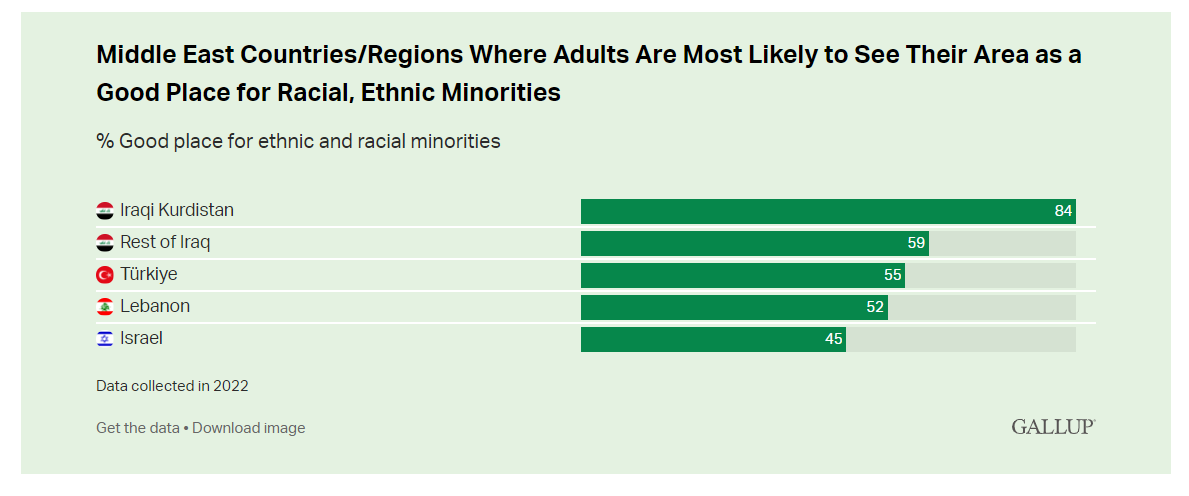 ? (84%)دانیشتوانی ئەو ناوچانەی حكومەتی هەرێمی كوردستان ئیدارەیان دەدات, دەڵێن شارەكەیان شوێنێكی ئارامە بۆ كەمینە نەتەوەییەكان, ئەو ژمارەیە زۆر لەناوچەكانی تری عێراق بەرزترە كە (59%), بەرزتریشە لەتەواوی ناوچاكانی تری خۆرهەڵاتی ناوەڕاست كە كەمینەكانی تیادا دەژین.
