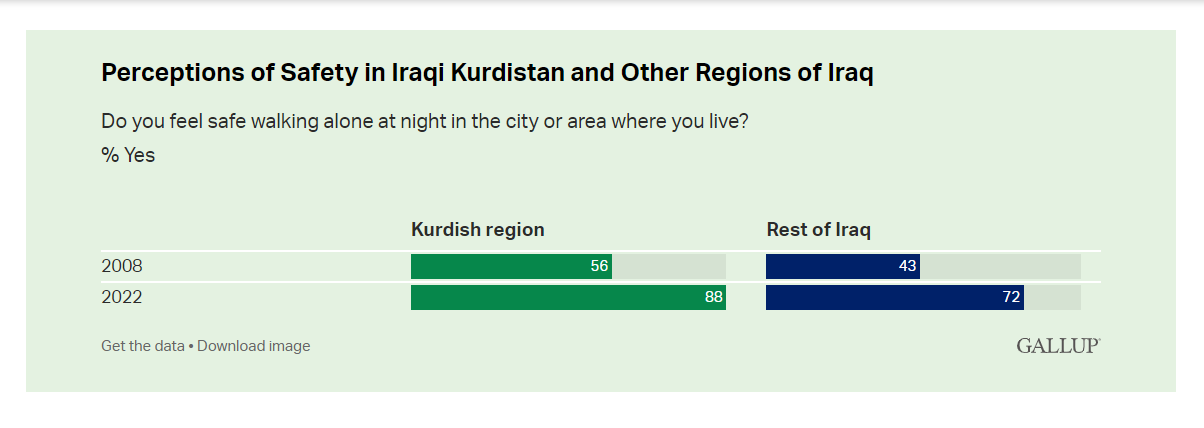 ?لەساڵی (2008)دا, لە(56%)دانیشتوانی ناوچە كوردنشینەكان ئاماژەیان بەوەداوە كە هەست بەسەقامگیری دەكەن كاتێك شەوانە لەناوچەكانیان و شارەكانیان بەتەنیا دەسوڕێنەوە, كە جیاوازی زۆری هەبووە لەناوچەكانی تری عێراق.