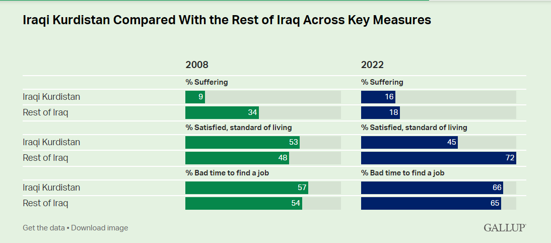 ?لەگەڵ باشبونی دۆخی ئابوری لەعێراق, هاوڵاتیانی كوردستان وایدەبینین لەڕووی ئابوریە دۆخیان باشنیە, لەساڵی (2008) ڕێژەی (9%) ئەو كەسانەی لەناوچە كوردییەكان دەژین پیاوانبووە دۆخی ژیانیان خراپە, لەكاتێكدا ڕێژەكە لەناوچەكانی تری (34%)بووە, بەڵام لەساڵی (2022)دا, ڕێژەی ئەو كەسانەی لەكوردستان پێیانوایە كە دۆخی ژیانیان خراپە بەرزبووتەوە بۆ (16%) و نزیكبووتەوە لە ڕێژەی عێراق كە (18%)یە.