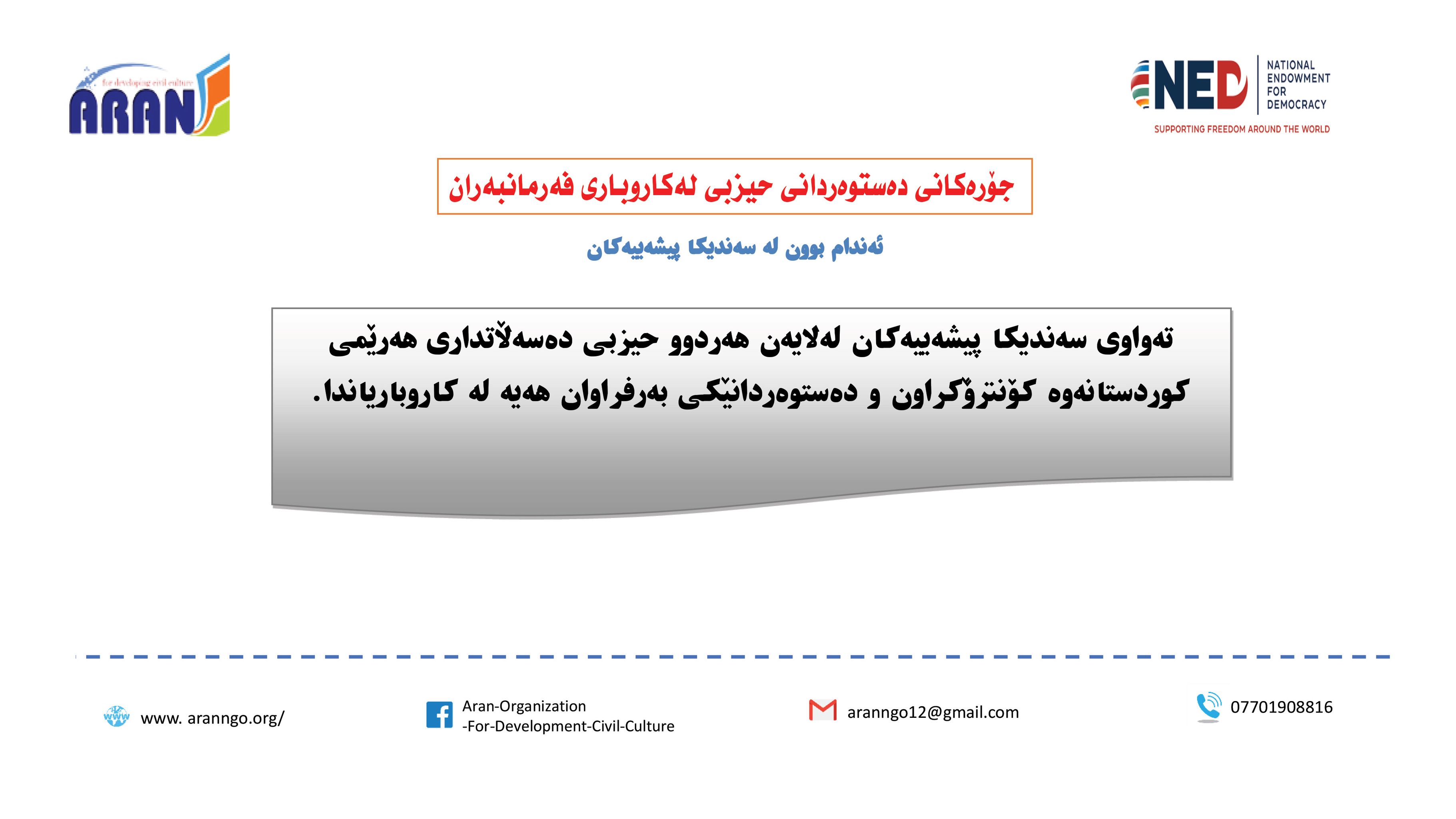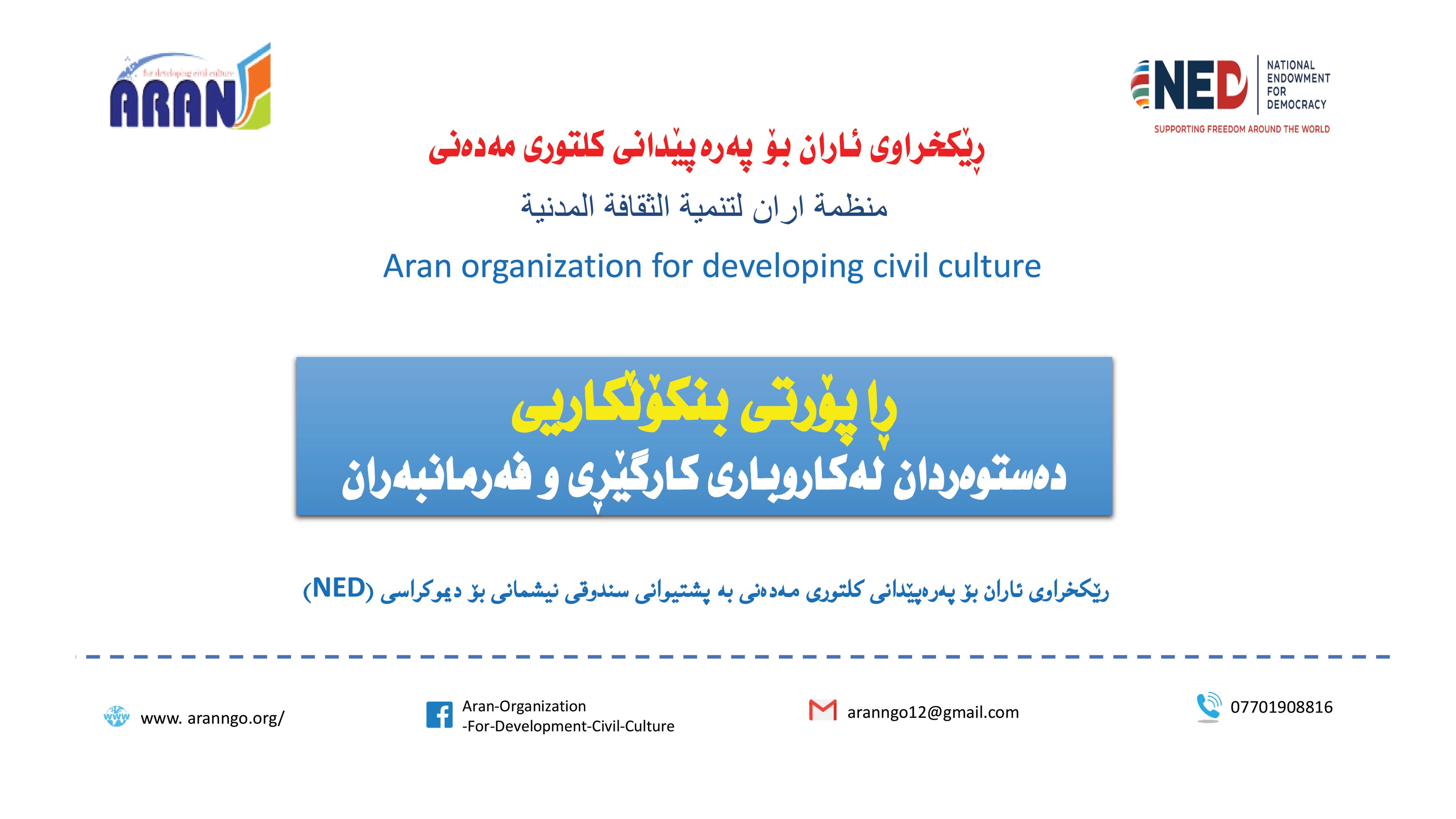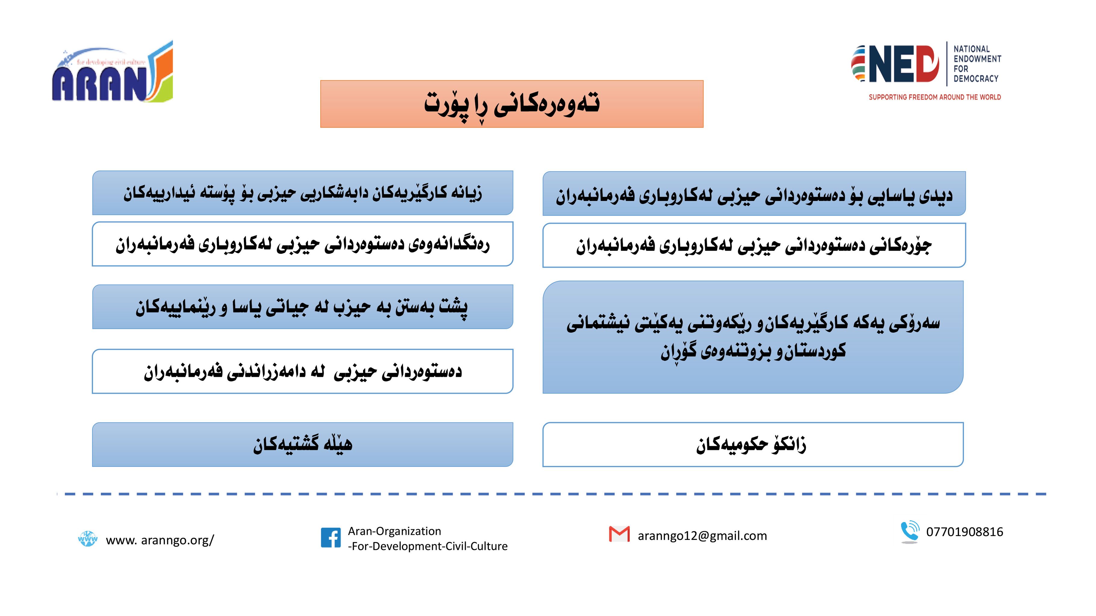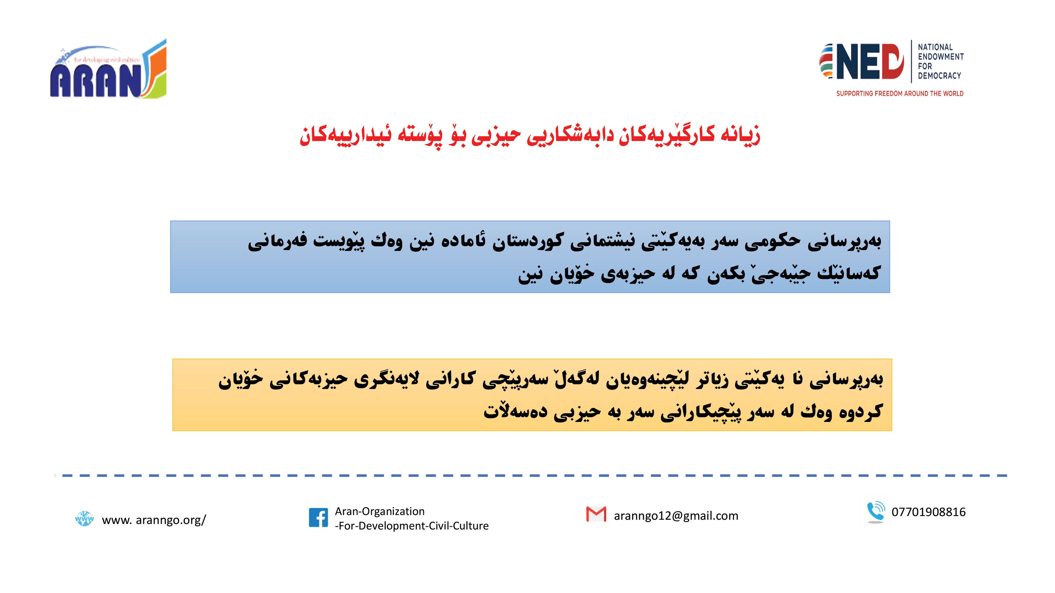 رێكخراوی ئاران بۆ پەرەپێدانی كلتوری مەدەنی بە بەپشتیوانی سندوقی نیشتمانی بۆ دیموكراسی (NED) راپۆرتێكی لەبارەی (دەستوەردانی حزبی لە كاروباری فەرمانبەران) بڵاو كردەوە و بەگوێرەی راپۆرتەكە: