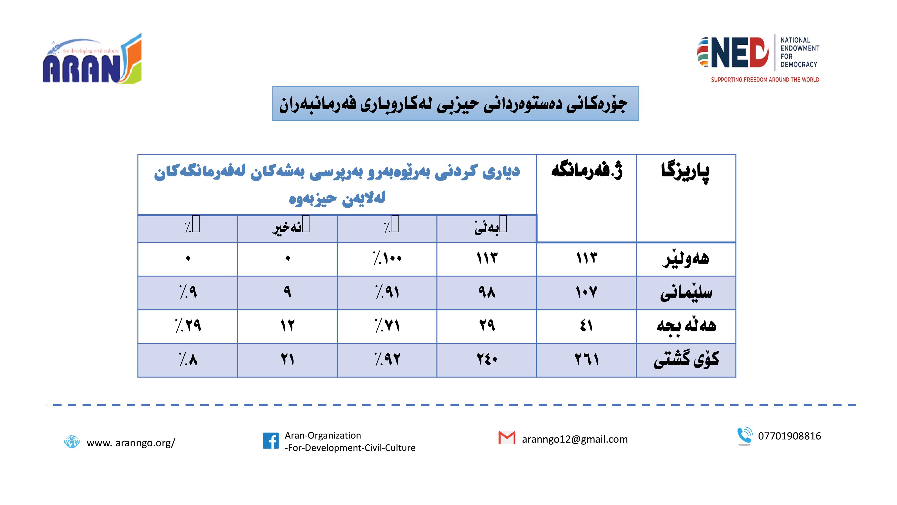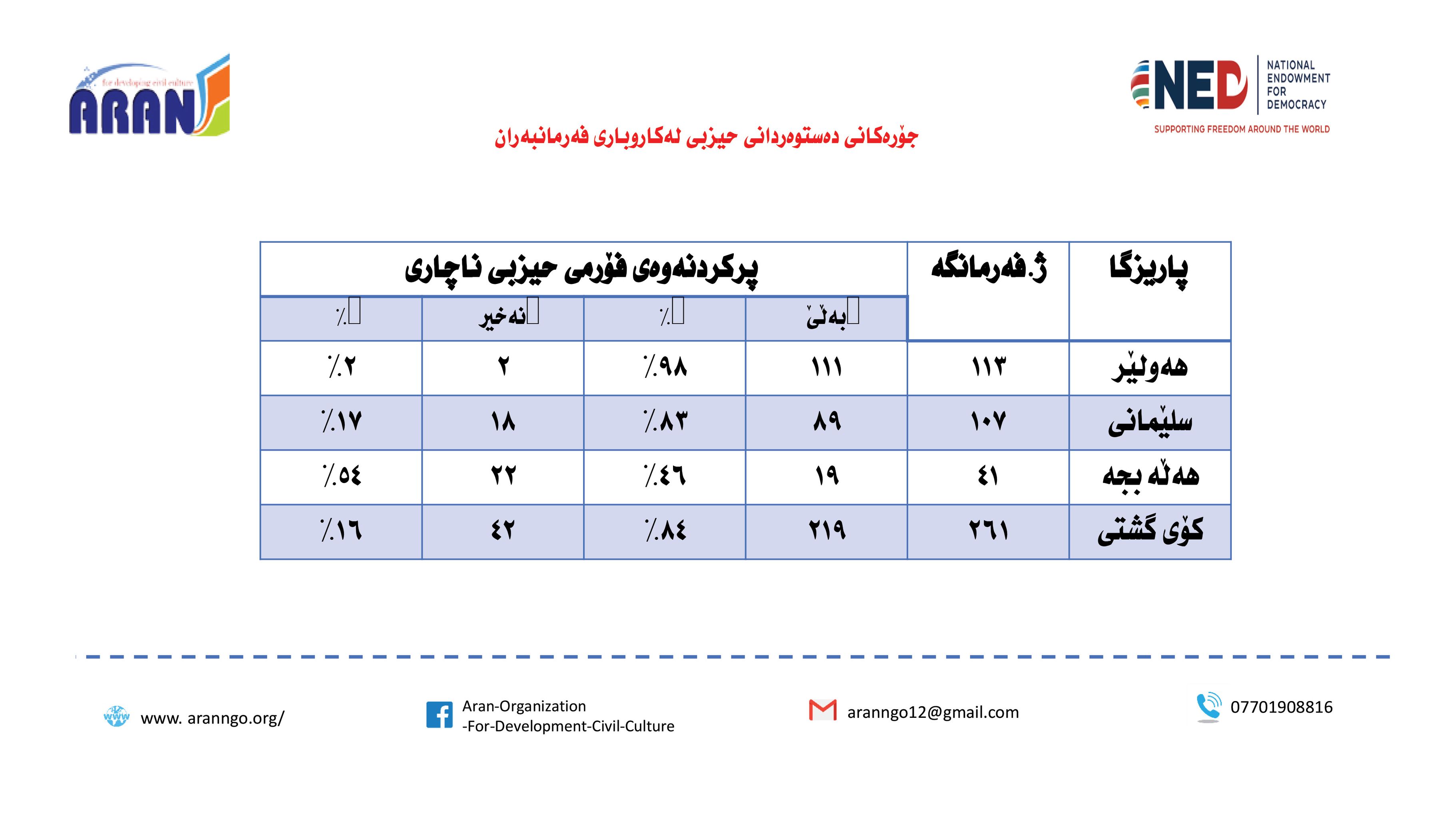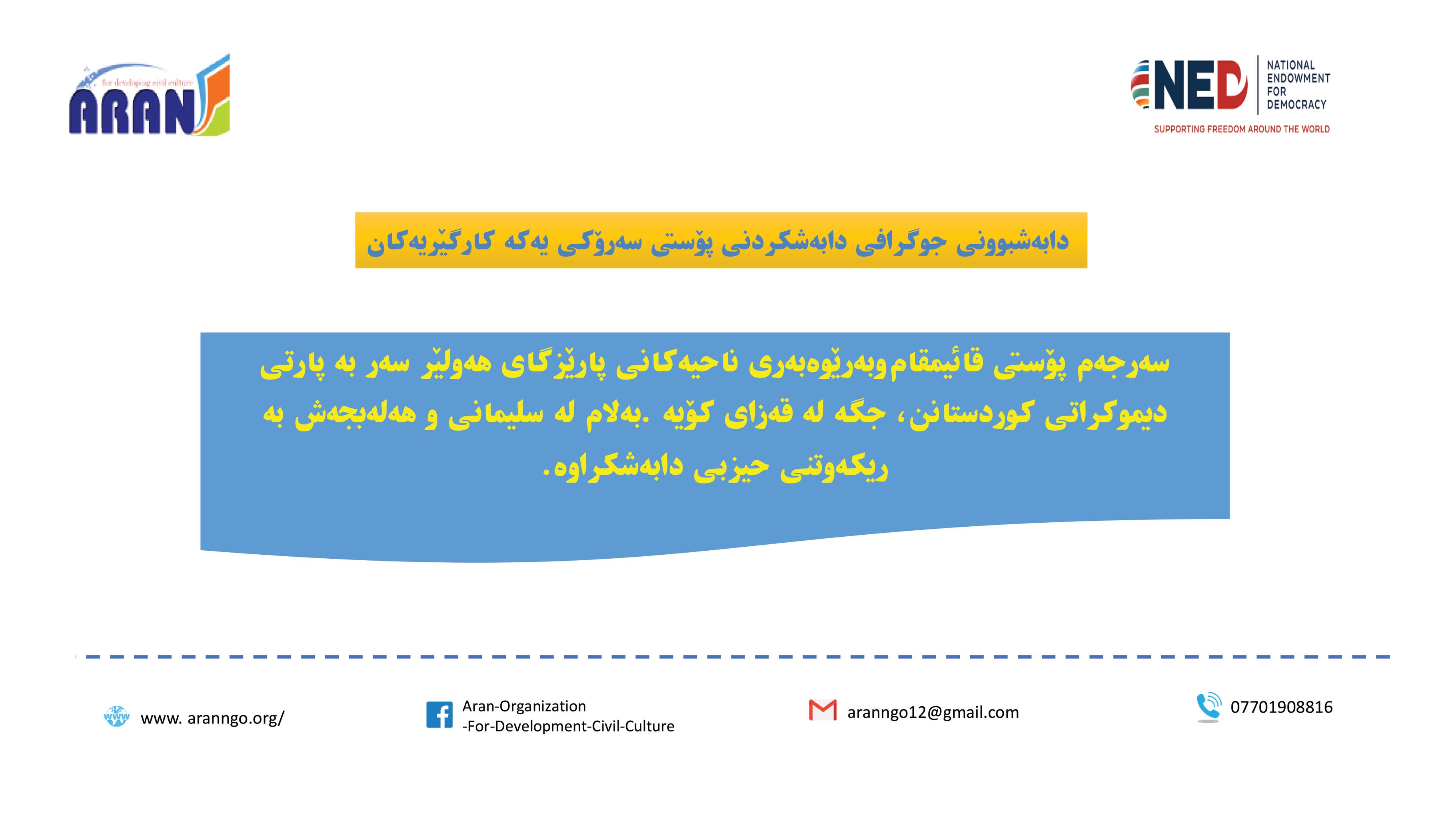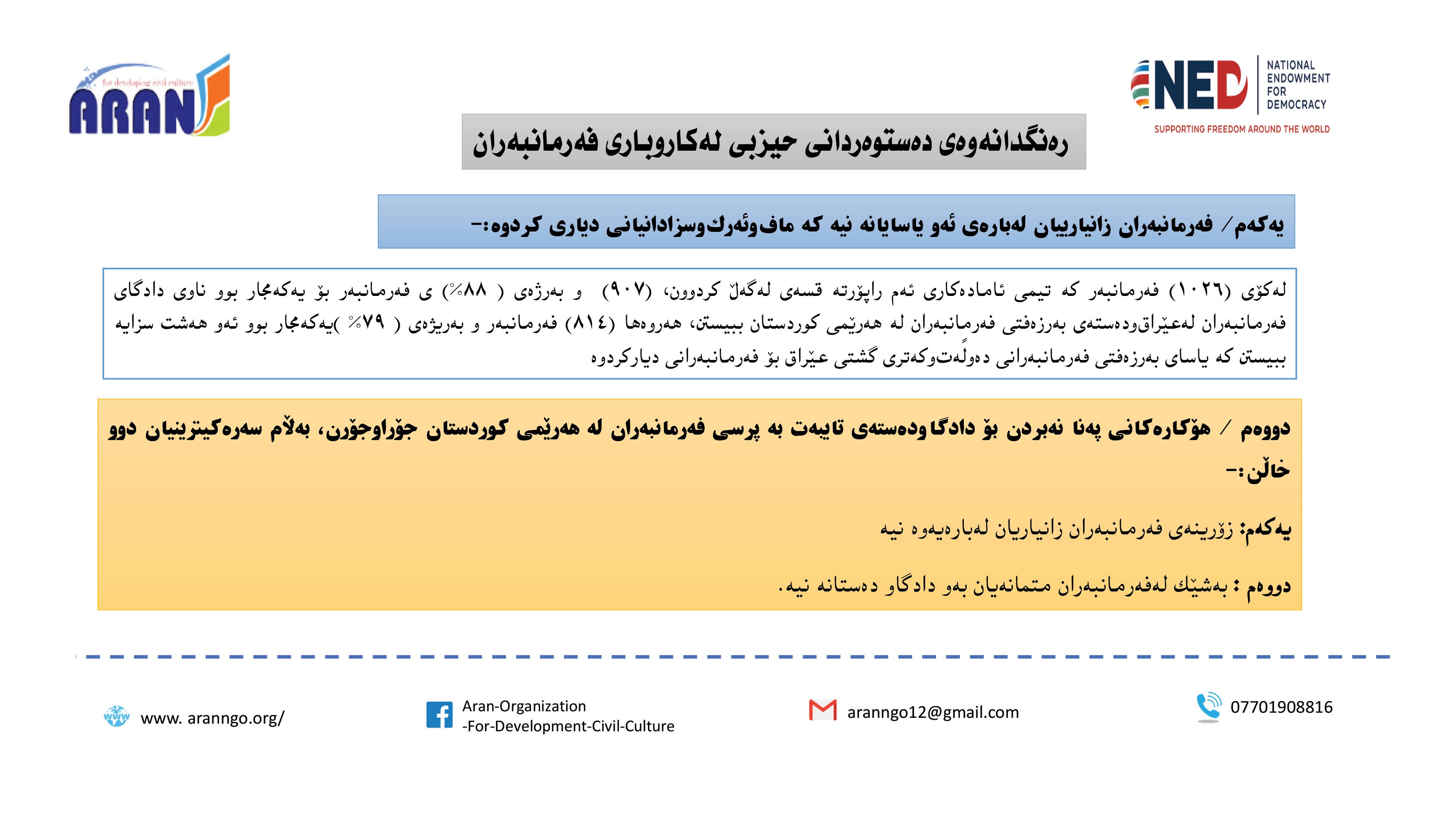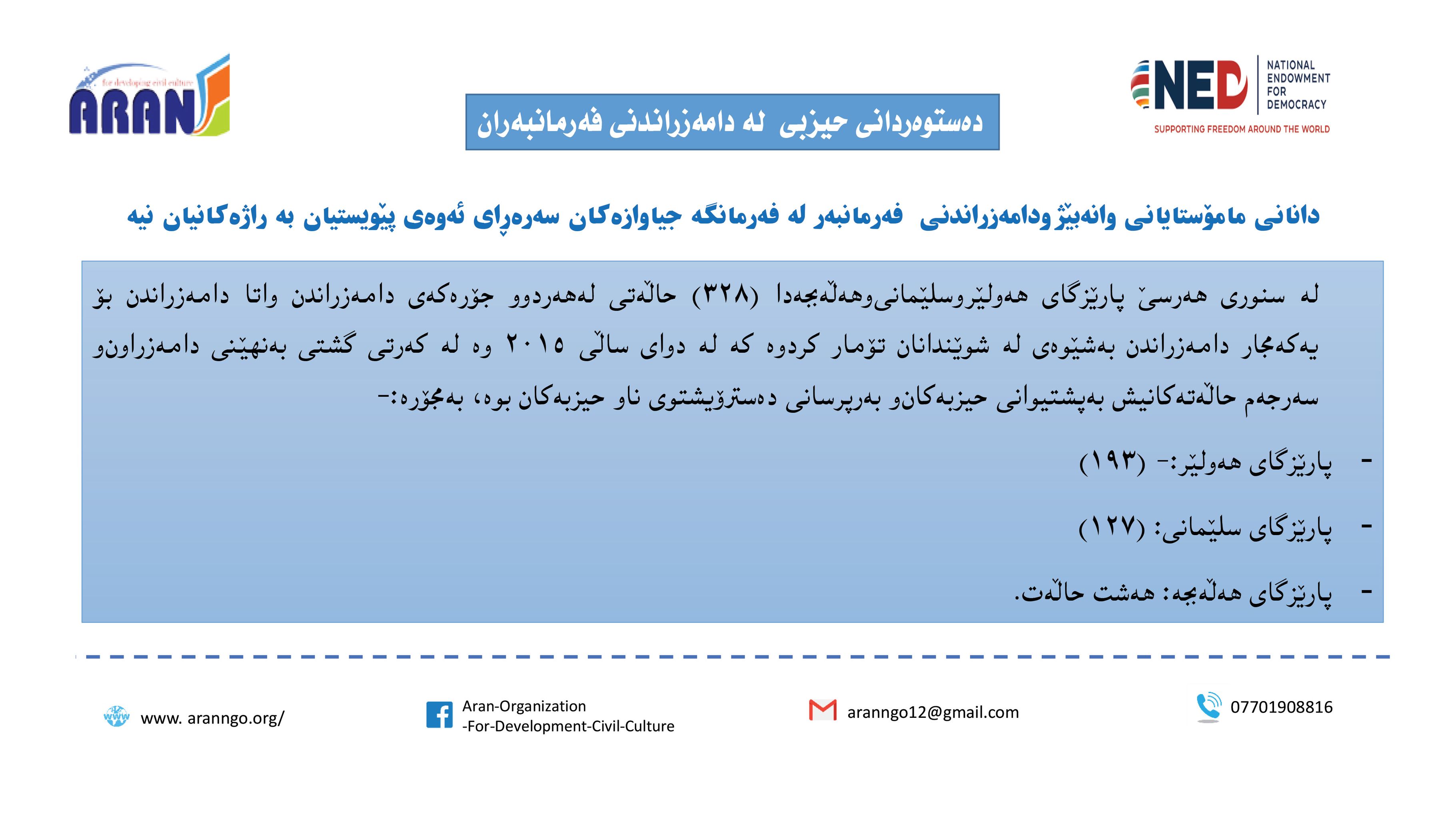 رێكخراوی ئاران بۆ پەرەپێدانی كلتوری مەدەنی بە بەپشتیوانی سندوقی نیشتمانی بۆ دیموكراسی (NED) راپۆرتێكی لەبارەی (دەستوەردانی حزبی لە كاروباری فەرمانبەران) بڵاو كردەوە و بەگوێرەی راپۆرتەكە: