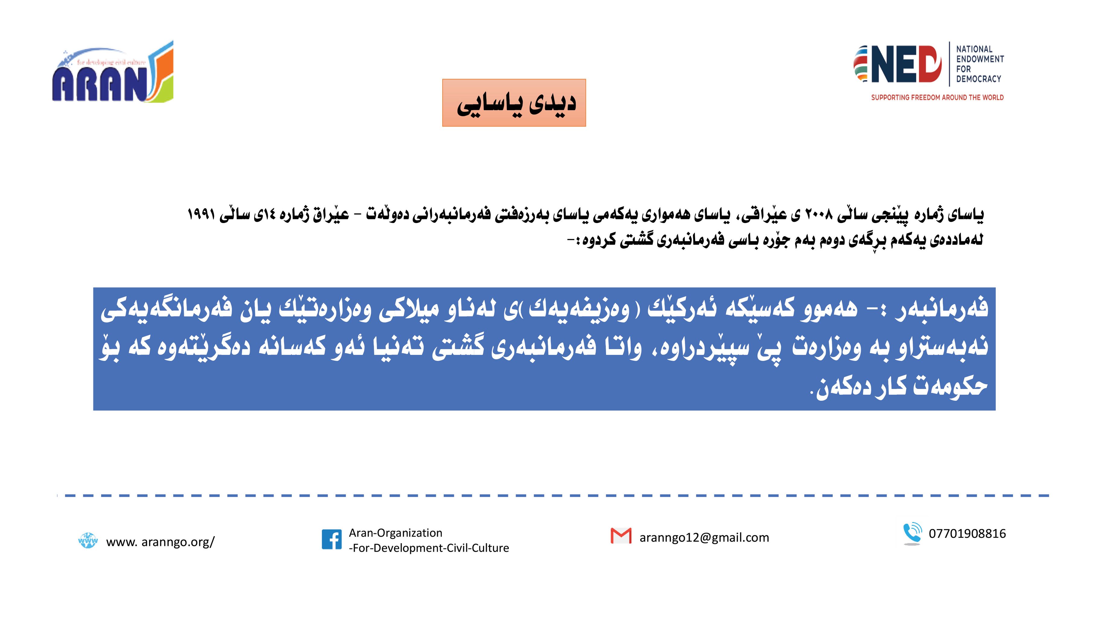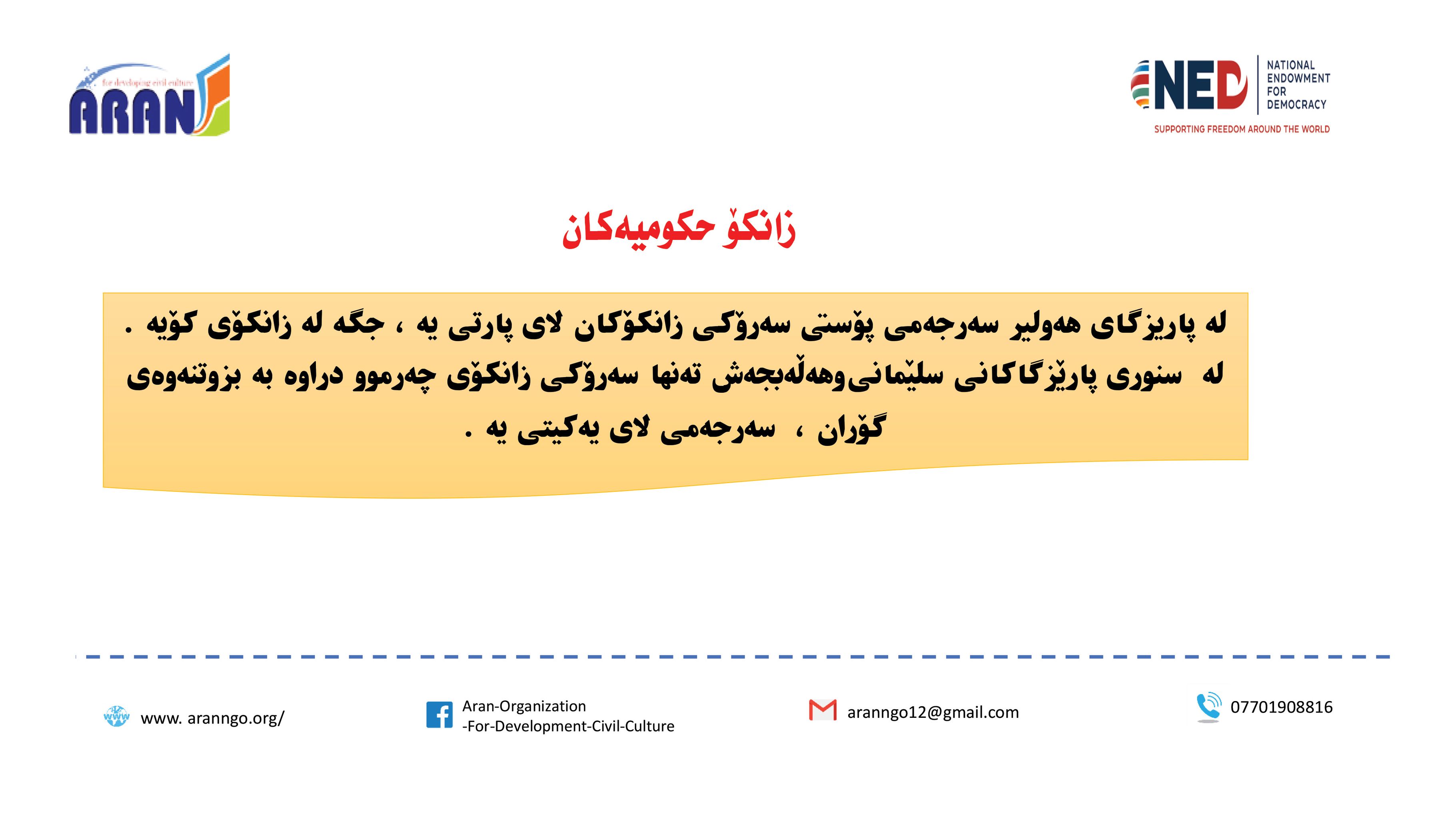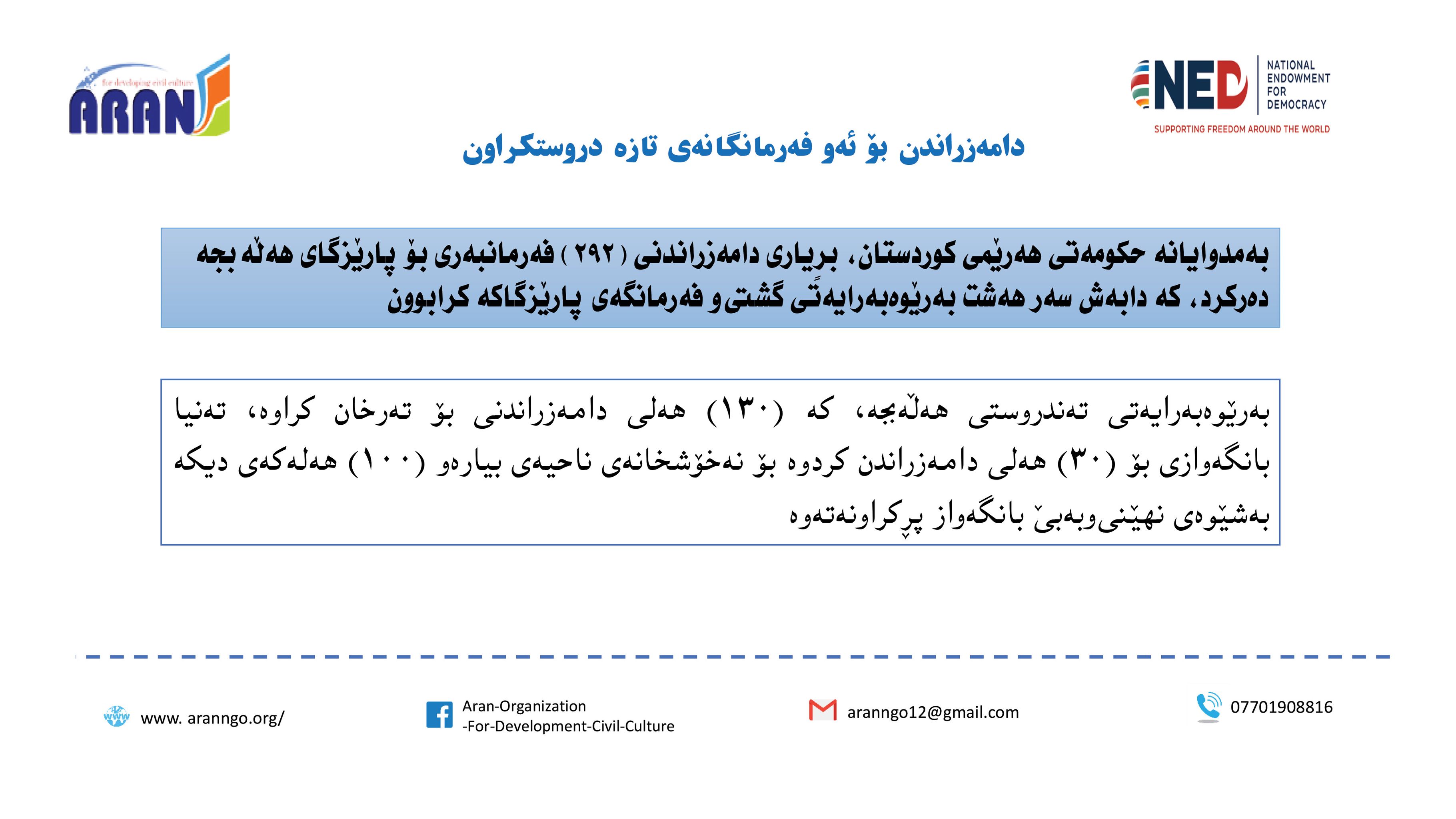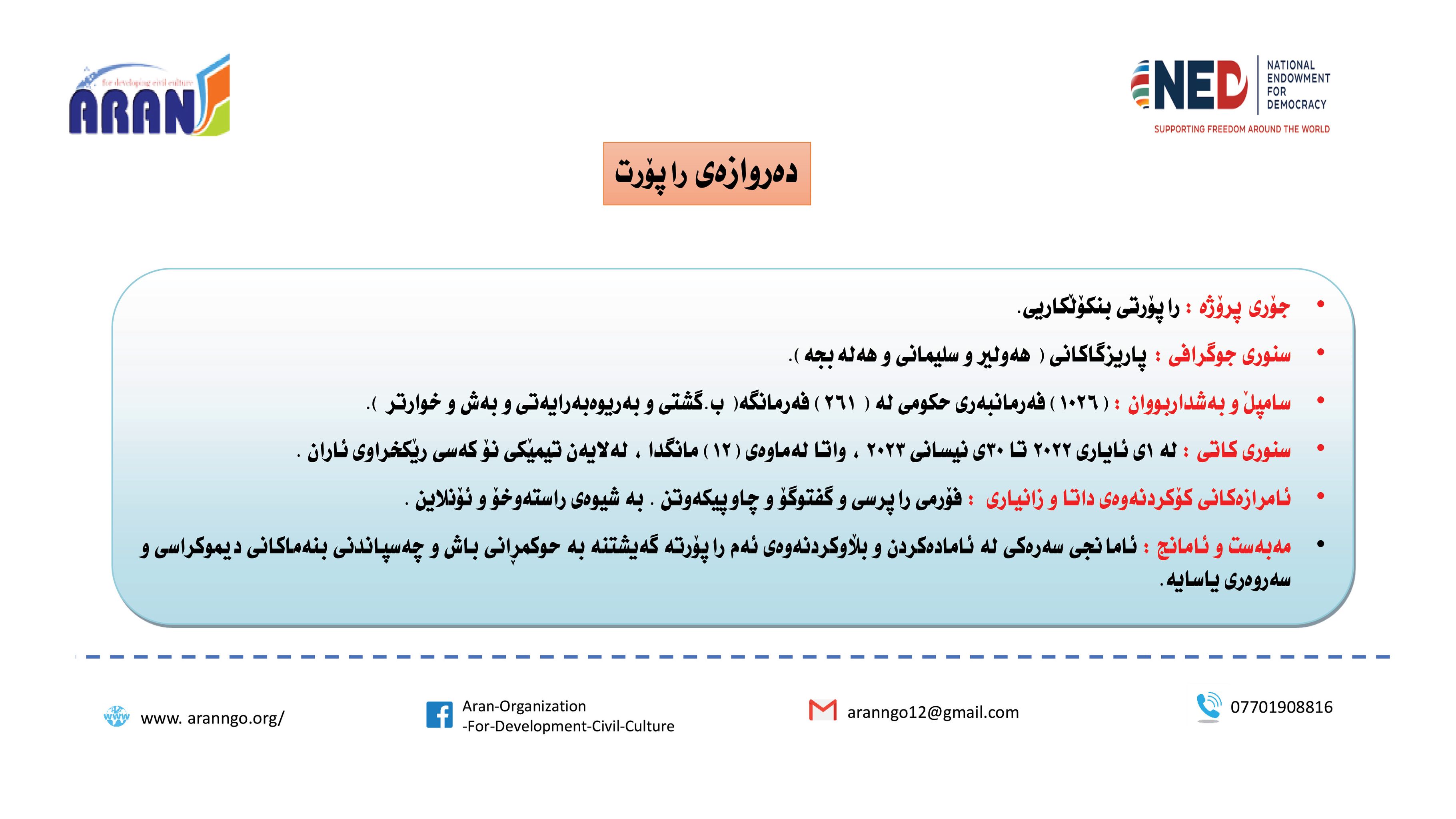 رێكخراوی ئاران بۆ پەرەپێدانی كلتوری مەدەنی بە بەپشتیوانی سندوقی نیشتمانی بۆ دیموكراسی (NED) راپۆرتێكی لەبارەی (دەستوەردانی حزبی لە كاروباری فەرمانبەران) بڵاو كردەوە و بەگوێرەی راپۆرتەكە: