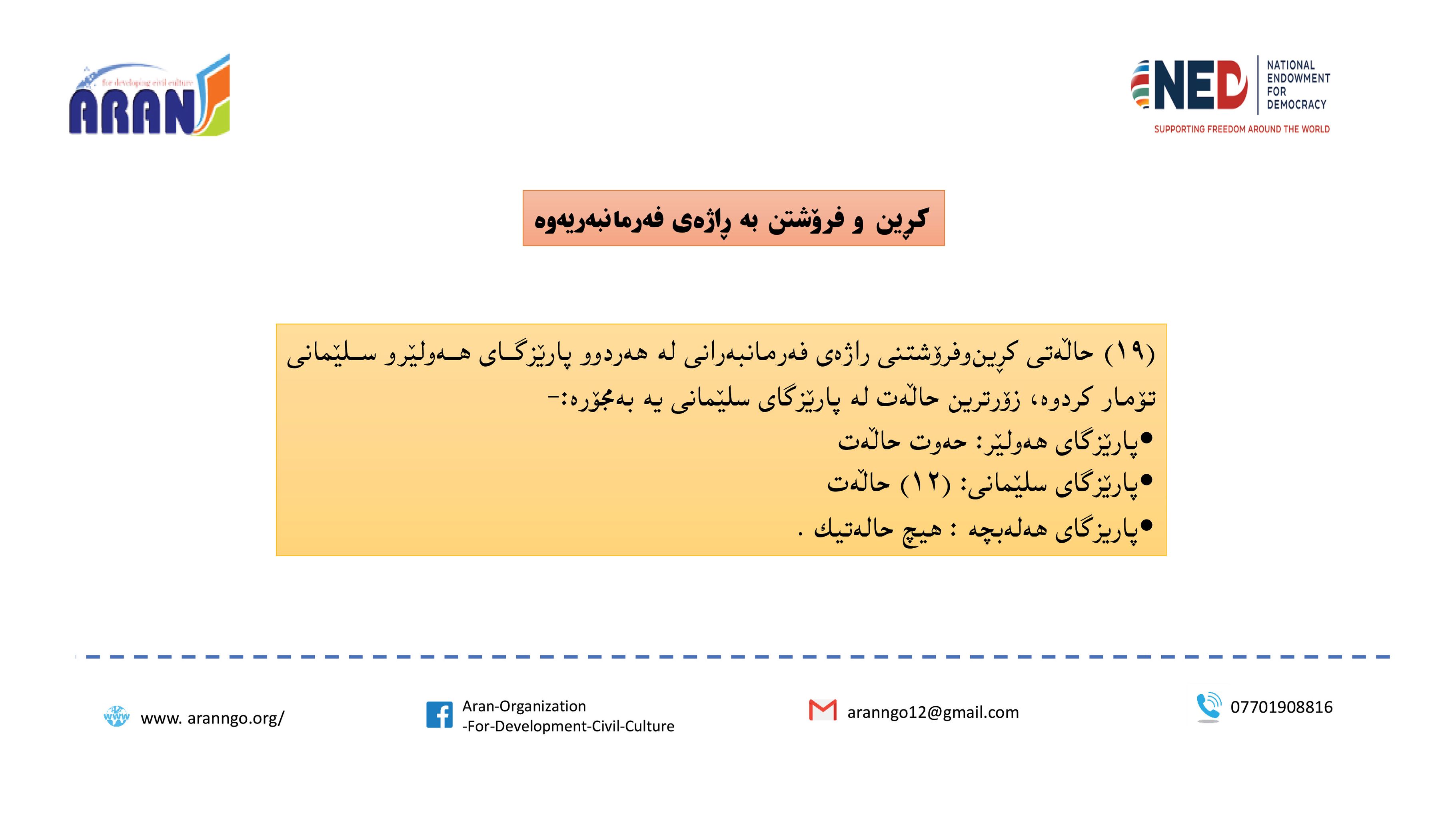 - 19 حاڵەتی كڕین و فرۆشتنی راژەی فەرمانبەران لەهەردو پارێزگای هەولێر و سلێمانی تۆماركراون، كە لە هەولێر حەوت حاڵەت و لە سلێمانی 12 حاڵەت بون.