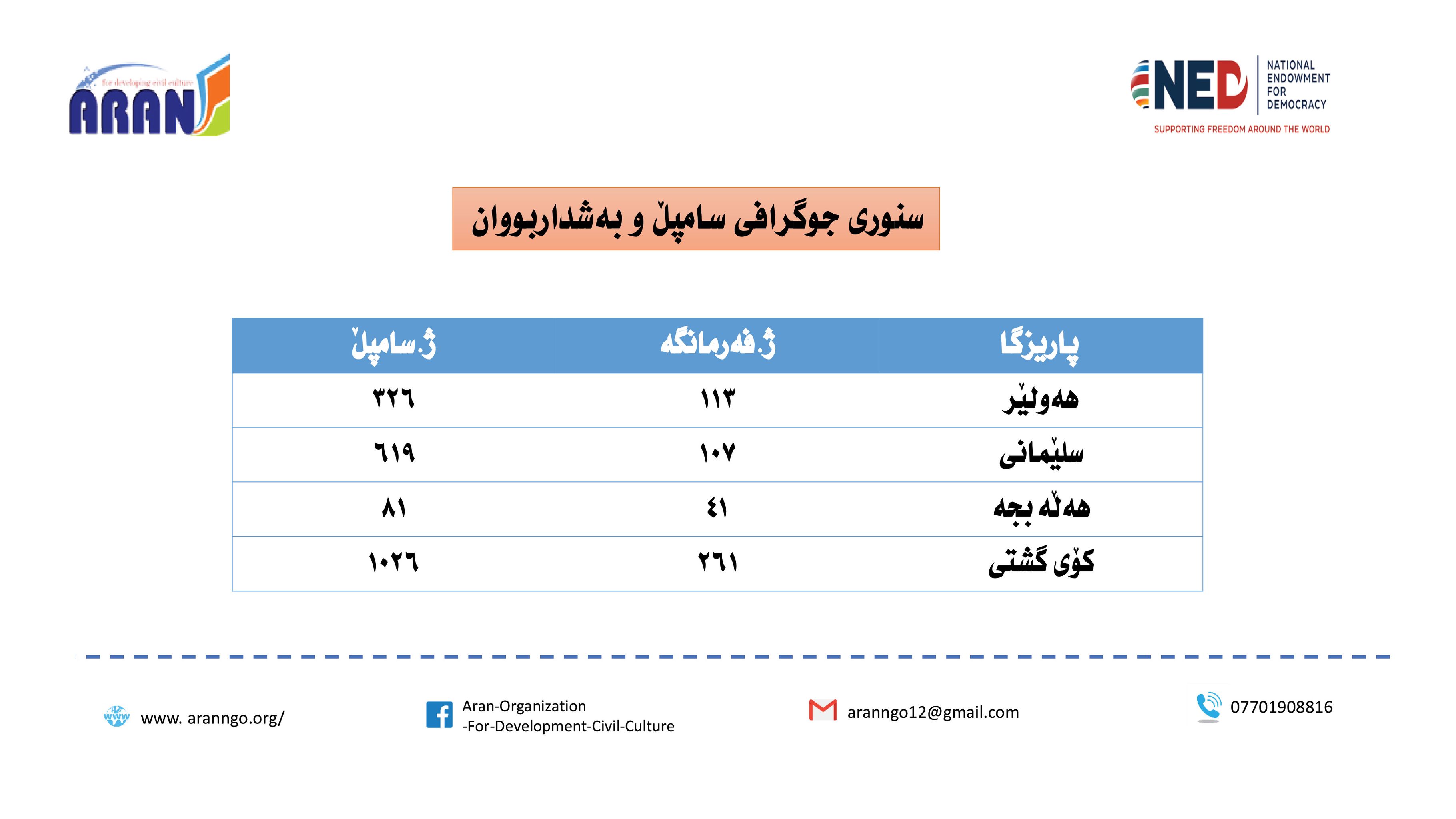 - پارێزگای هەولێر:- قسە لەگەڵ (326) فەرمانبەر بە پلەی جیاواز كراوە كە سەر بە (113) فەرمانگەی حكومین.