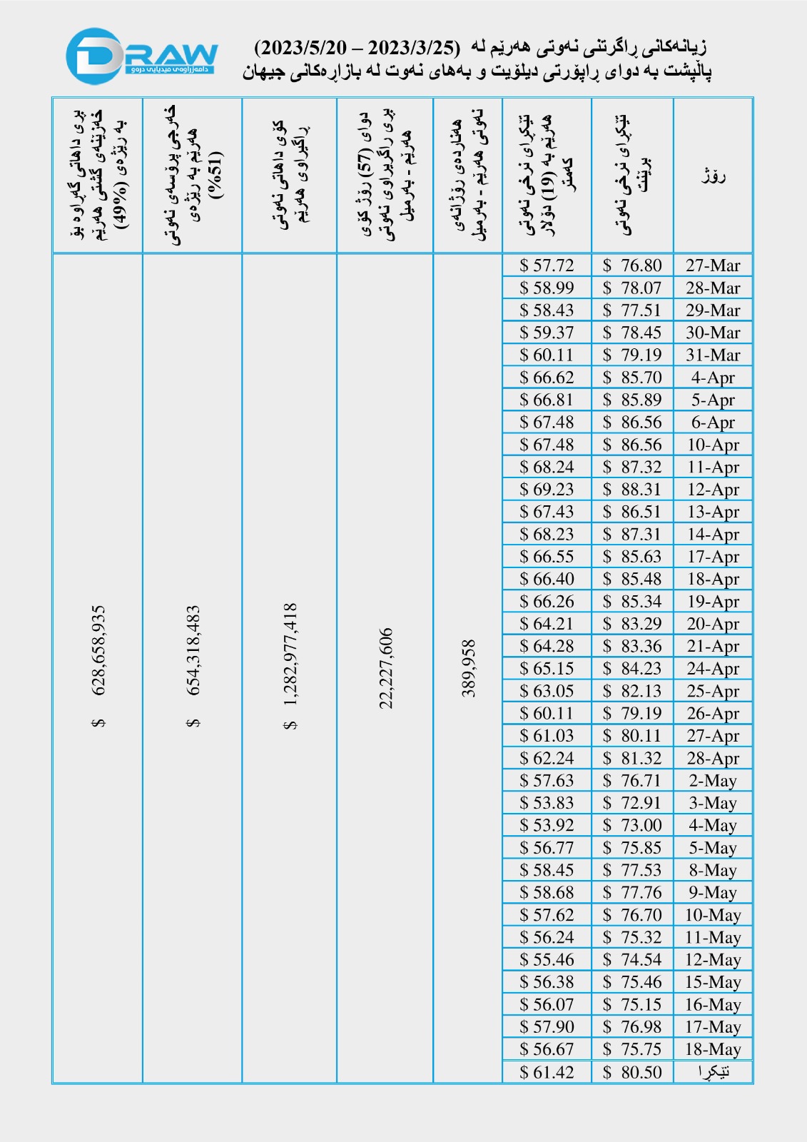 لێرەدا تیشک دەخەینە سەر ئەو زیانە داراییانەی لە ڕاگرتنی نەوتی هەرێم لە ماوەی (25/3/2023 – 20/5/2023) دەکەوێتەوە. بە جۆرێک؛