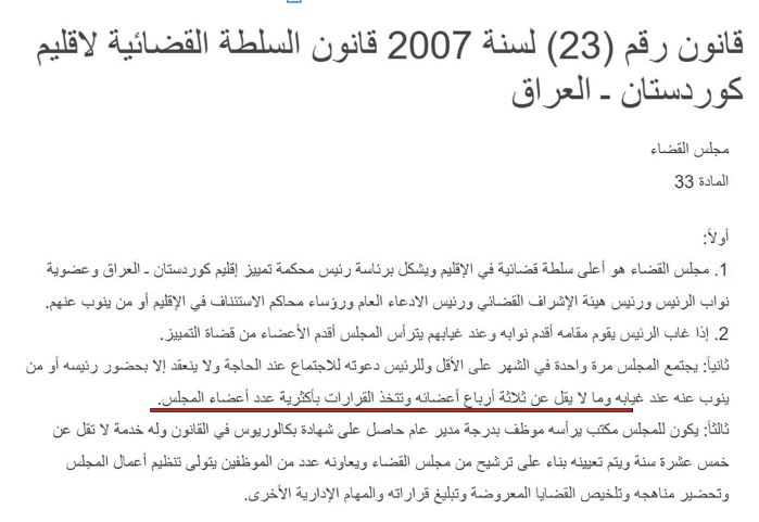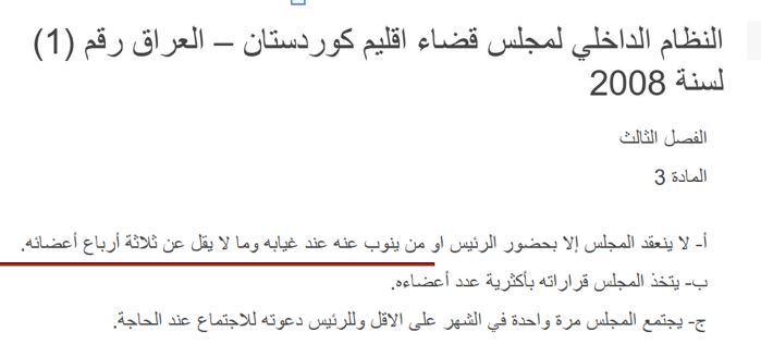 هەروەها بە پێی بڕگەی (ا) لە مادەی 3ی پەیڕەوی ناوخۆی ئەنجومەنی دادوەری هەرێمی كوردستانیش "كۆبوونەوەی ئەنجومەنی دادوەری ناكرێت تا 3/4ی ئەندامانی ئامادە نەبێـت"