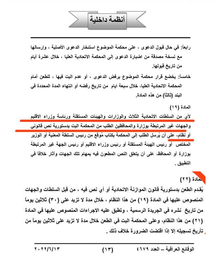 بەلەبەرچاوگرتنی بڕیارەكانی دادگای فیدراڵی هەموو ئەو گۆڕانكاری و زیادكردنانەی كە لە پرۆژە یاسای بودجەی عێراقدا هاتووە، ئەگەر لە دادگای فیدراڵی تانەیان بەپێی پەیڕەوی ناوخۆی دادگای فیدراڵی لە ماوەی (30) رۆژدا لەدوای بڵاوكردنەوەی لە رۆژنامەی فەرمیدا دەتوانرێت تانە لە یاسای بودجە بدرێت لە دادگای فیدراڵی.