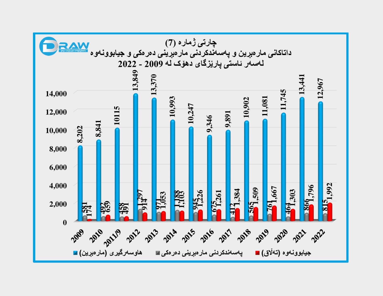 هەر بەپێ ئامارەکان ساڵی (2022) بەرزترین ڕێژەی جیابوونەوەی تێدا تۆمارکراوە کە ژمارەکەی گەیشتووە بە (13 هەزار و 967) حاڵەت. (بڕوانە چارتی ژمارە(3)).