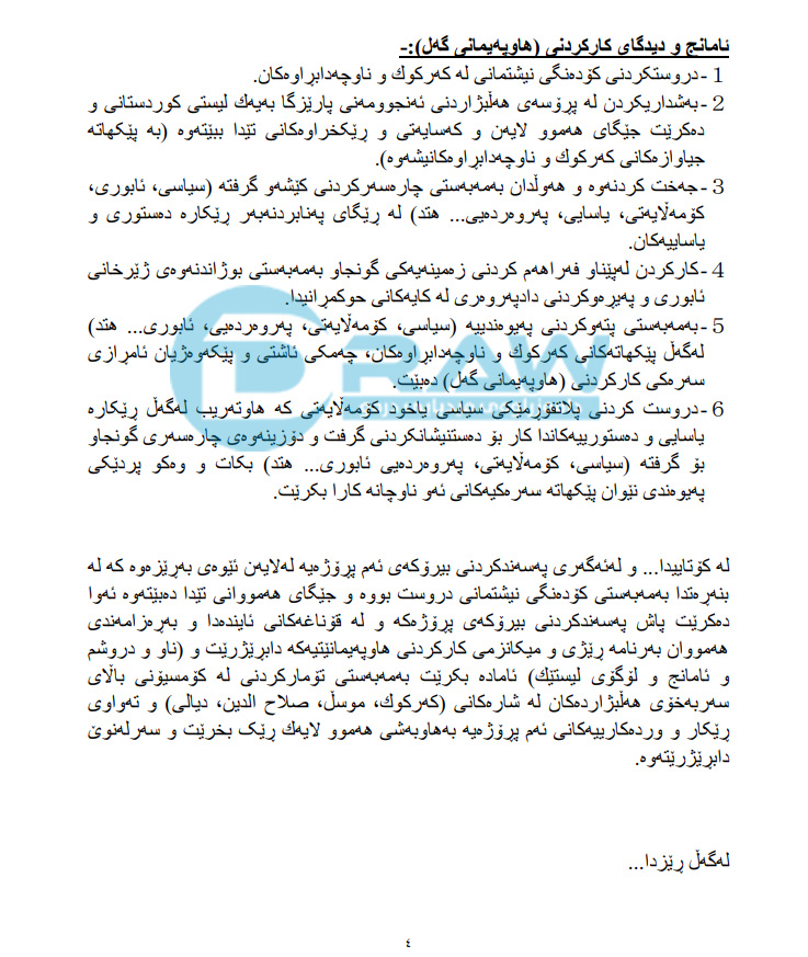 لە كۆتایی پرۆژەكەدا كە ئاراستەی حزبە كوردستانییەكانی كردووە ئاماژە بەوەكراوە: ئەگەر پرۆژەكە لەلای ئێوە پەسەندكرا بەرنامەرێژی و میكانیزمی كاركردن دابڕێژرێت (ناوو ئامانج و درووشم لۆگۆی لیستێك) ئامادەبكرێت بەمەبەستی تۆماركردنی لە كۆمسیۆنی باڵای هەڵبژاردنەكان لە شارەكانی (كەركوك، موسڵ، سەڵاحەدین، دیالە).
