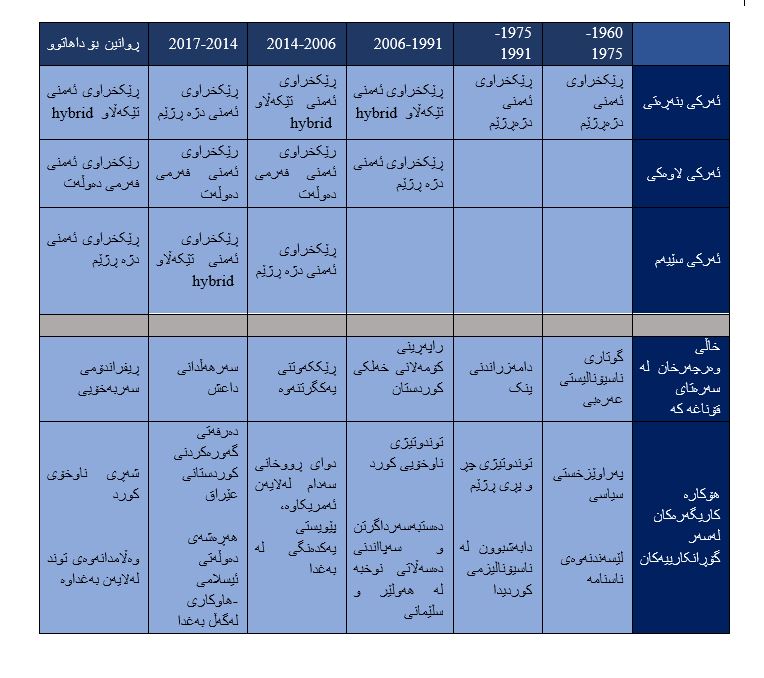 لەسەر ئەم بنەمایانە ئەو خشتەیەی خوارەوە وەسفی سێ جۆرە پێشمەرگە لە سێ کاتی جیاوازی ماوەی یەک سالدا دەکات لەچەند بارودۆخێکدا . لێرەدا ئاماژە بە هۆکاری وەکو ڕاکێشان و پاڵنان دەکەین کە کاریگەرییان هەیە لەسەر زاڵبونی ڕێکخراوەکە و کاتەکەی. جا بۆ ئەوەی پەیوەندی پێشمەرگە لەگەڵ هەردوو حکومەتی هەرێم و دەوڵەتی عێراقدا مانادار بێت، پێویستمان بە ژماردن و شیکارکردنی هەموو فاکتەرە سیاسی و کۆمەڵایەتیەکانی ژیانی دەیان ساڵەی کۆمەلانی خەڵکی کوردستانە لە چوارچێوەی عێراقدا .