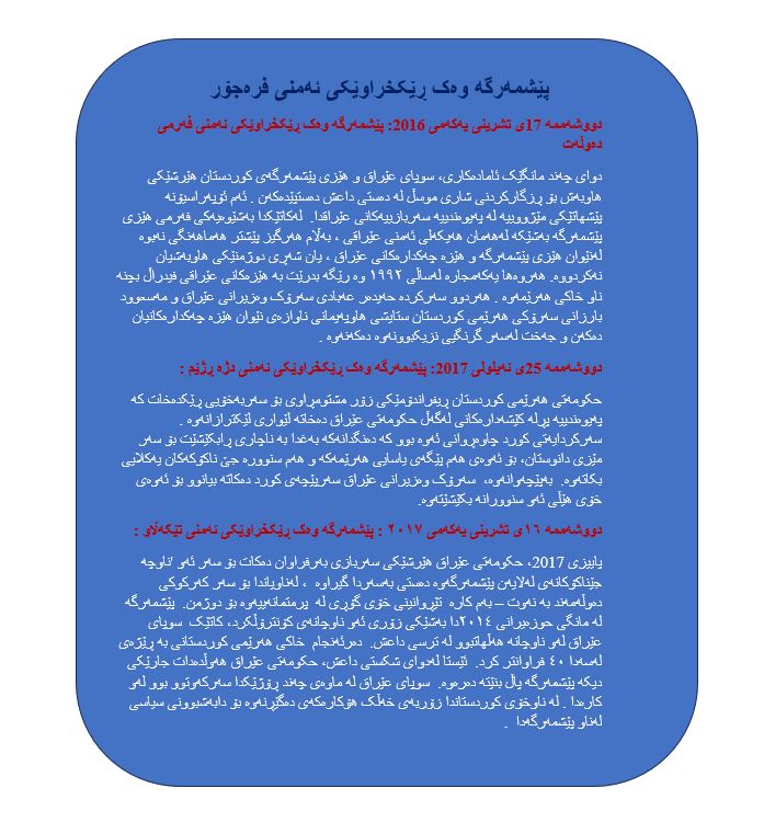 بۆ ئەوەی پەیوەندییە ناوخۆییەکانی هەرێمی کوردستان هەروەها لە نێوان حکومەتی هەرێمی کوردستان و بەغدا بەشێوەیەکی بنیاتنەرانە و بە ئاشتیانە پەرەی بدرێت ، ئەوە پێویستە لەسەر ئەو هاوبەشە نێودەوڵەتیانەی کە ئێستا پاڵپشتیی پێشمەرگە و هێزە ئەمنییەکانی عێراق دەکەن، لە دڵەوە ئەم سێ پێشنیارە وەربگرن :