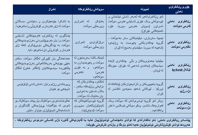 بەگشتی، حاڵەتی ململانێ و لەرزۆکی دەوڵەتێک هاوتەریبە بە بوونی ڕێکخراوی ئەمنیی لە دەرەوەی دامەزراوە فەرمییەکانی دەوڵەتەکە . نەبوونی دەسەڵاتی رەهای دەوڵەت بەسەر بەکارهێنانی هێزە فەرمیەکانی خۆی دەرفەت دەڕەخسێنێت بۆ بوون و گەشەکردنی ڕێکخراوی ئەمنیی بەدیل . دوو تێڕوانین سەبارەت بە ڕێکخراوە ئەمنییەکان کە لە دەرەوەی دامەزراوە فەرمیەکانی دەوڵەتدا هەن پەیوەندیدارن بەم ڕاپۆرتەوە: