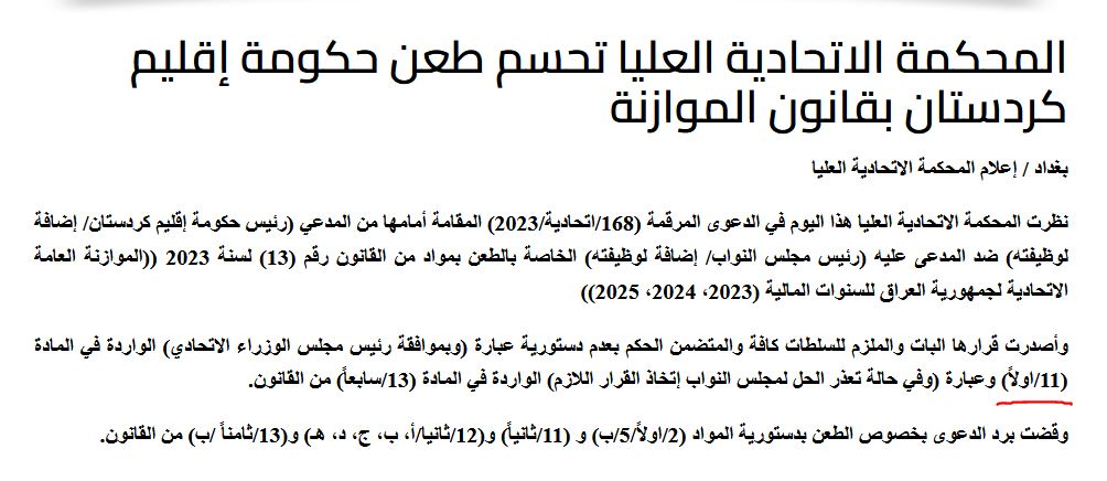 بە پێی بڕیارەكەی دادگای باڵای فیدراڵی، كە ئەمڕۆ دادبینی بۆ داوای ژمارە (168/فیدراڵی/2023) كە لە لایەن مەسرور بارزانی سەرۆكی حكومەتی هەرێمەوە لە دژی سەرۆكی ئەنجومەنی نوێنەرانی عێراق تۆماركرابوو ئەنجامدا، داواكە تانە بوو لە ماددەی (13) یاسای بودجە بۆ ساڵەكانی (2023،2024 و 2025).