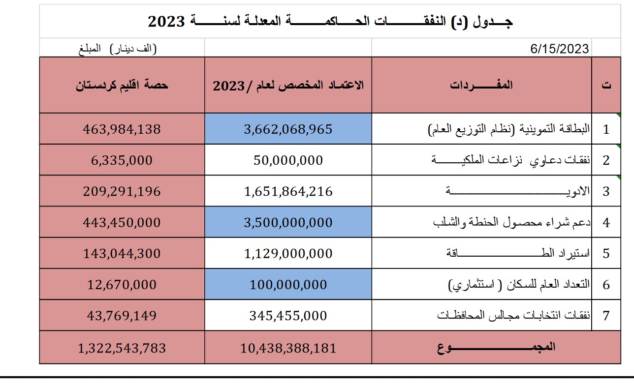"خەرجی هەرێمی كوردستان لە تێكڕای خەرجی راستەقینە دیاری دەكرێت، كە لە خشتەی (د)ی هاوپێچی ئەم یاسایەدا هاتووە (خەرجی حاكیمە)، لەلایەن وەزارەتی داراییەوە بەرەزامەندی سەرۆك وەزیران، خەرجدەكرێت".