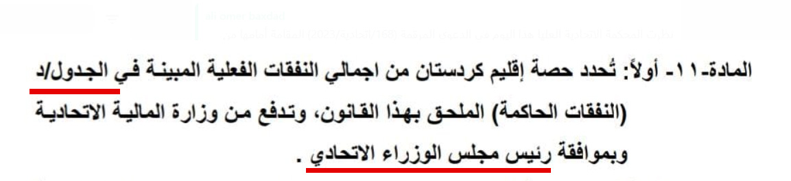 دەقی ماددەی 11 بڕگەی یەكەمی یاسای بودجەی عێراق: